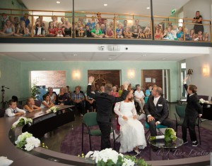 Welke kinderen kunnen zeggen dat ze de trouwdag van hun ouders (bewust) meegemaakt hebben? En hoe cool is het als dat wel zo is, en je hele klas naar het gemeentehuis komt om te zien hoe jouw ouders gaan trouwen?! De zoons van Bert en Marije kunnen hierover meepraten. Met z’n vieren kwamen ze helemaal in stijl aan bij het gemeentehuis waar naast de familie en vrienden de klassen van de beide jongens ze op stonden te wachten. Iedereen ging gezellig mee het gemeentehuis is wat zorgde voor een hele mooie ongedwongen sfeer in de raadzaal.