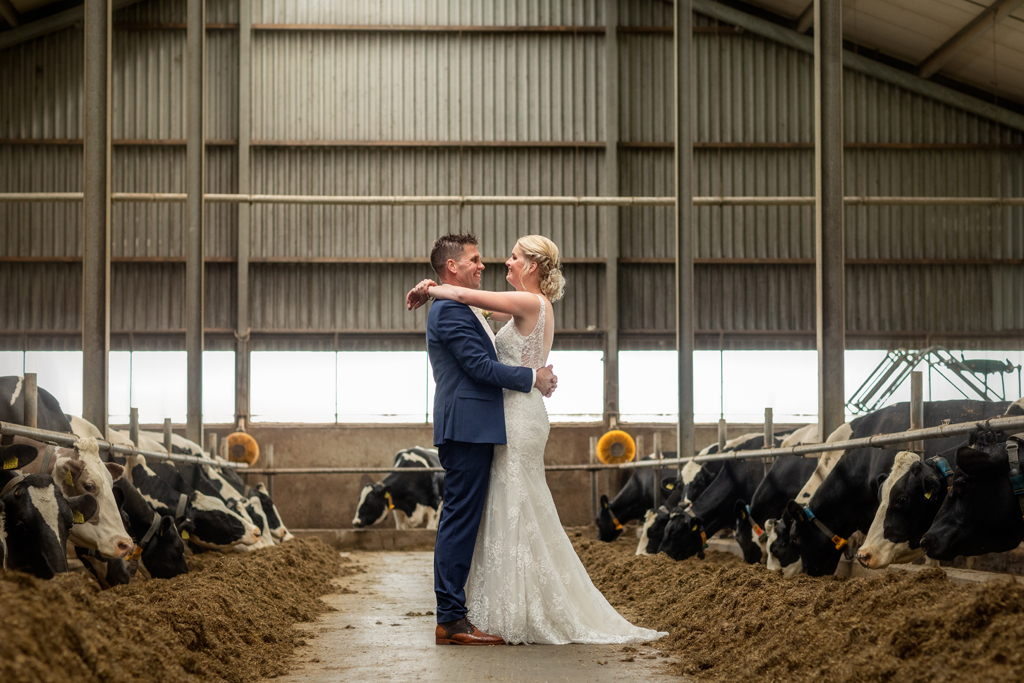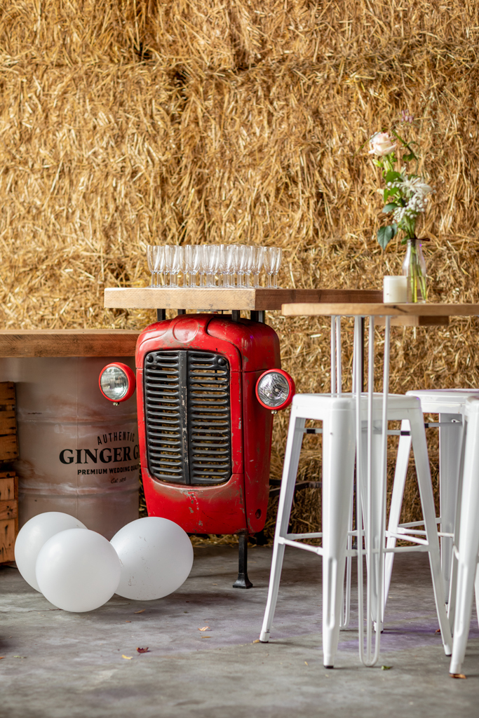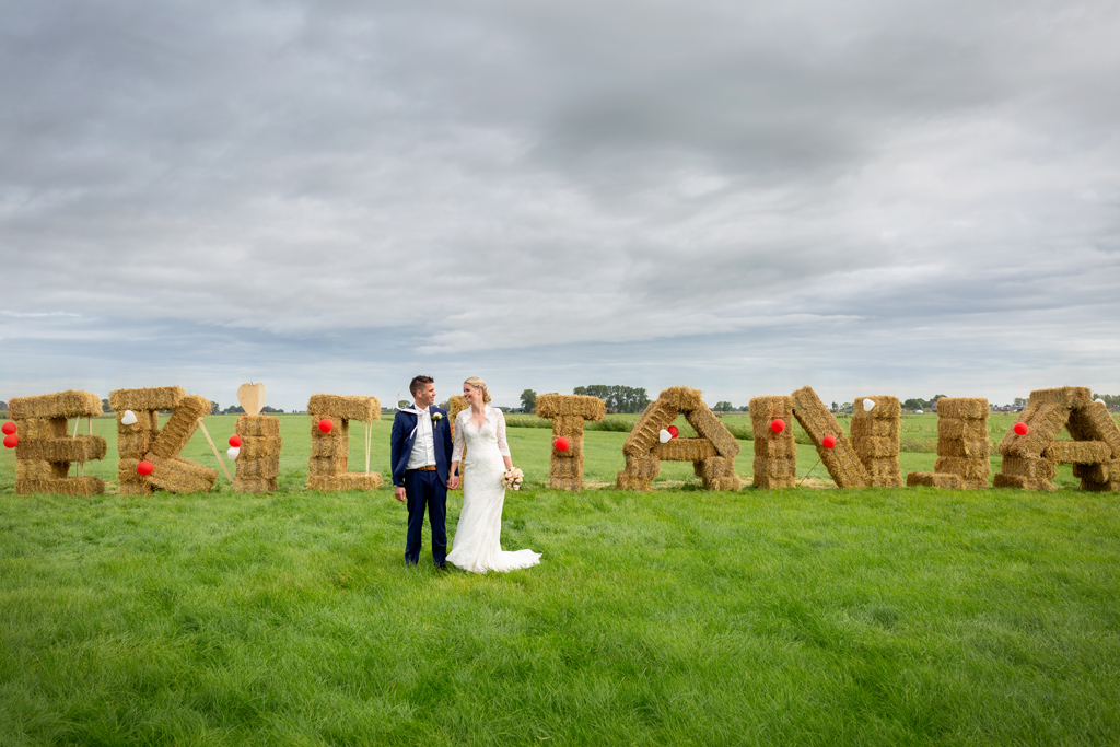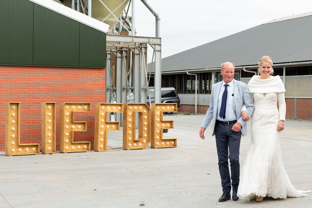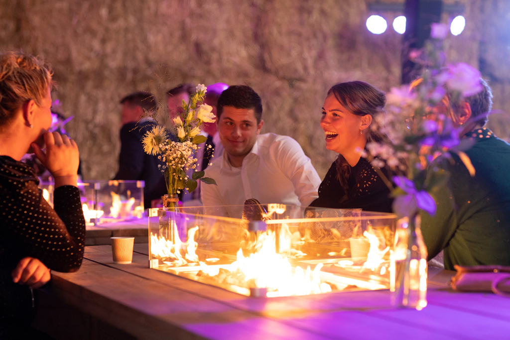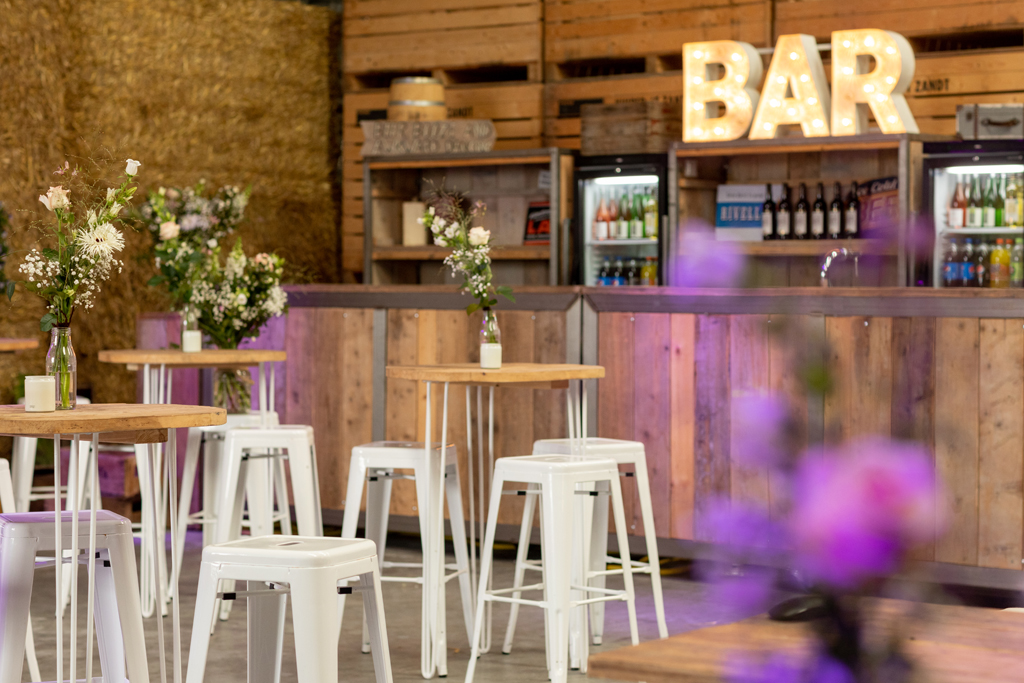 “Wat zijn we blij dat we onze trouwdag zo hebben kunnen doen als we voor ogen hadden.” Wauw, wat een werk hadden Eric & Tanja erin gestoken om van hun eigen boerderij, hun eigen woon- en werkplek een fantastische trouwlocatie te maken! De schuur waar ik een aantal weken eerder nog allerlei materiaal en voorraad in zag staan was nu een sfeervolle feestlocatie geworden met bar, koffiecorner, Photo Booth en zithoekjes rondom vuurtjes. Buiten naast de schuur een prachtig, intiem ingerichte plek om elkaar het ja woord te geven. Waarom ergens anders heen gaan wanneer je al deze mogelijkheden bij huis hebt en ze ook ziet?! Dat was ook de gedachte van Eric & Tanja. En wat het mooie was, je merkt het ook aan de sfeer. Want waar voel je je meer thuis dan thuis? Zó goed gedaan!