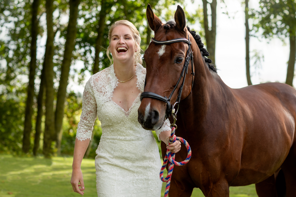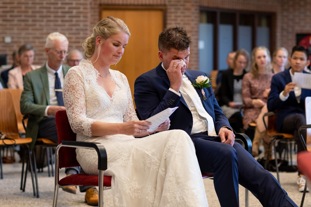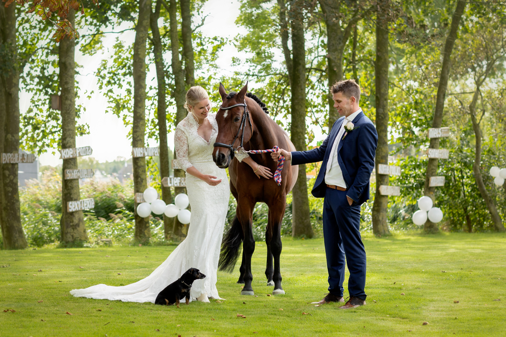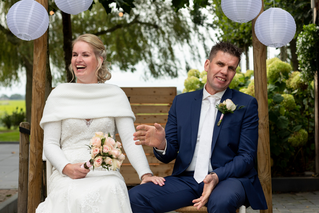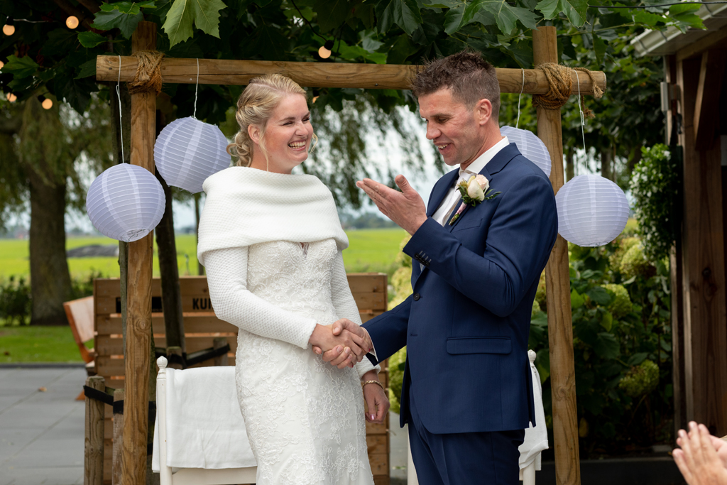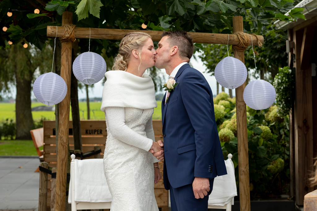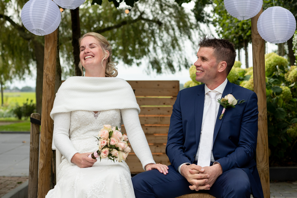 “Wat zijn we blij dat we onze trouwdag zo hebben kunnen doen als we voor ogen hadden.” Wauw, wat een werk hadden Eric & Tanja erin gestoken om van hun eigen boerderij, hun eigen woon- en werkplek een fantastische trouwlocatie te maken! De schuur waar ik een aantal weken eerder nog allerlei materiaal en voorraad in zag staan was nu een sfeervolle feestlocatie geworden met bar, koffiecorner, Photo Booth en zithoekjes rondom vuurtjes. Buiten naast de schuur een prachtig, intiem ingerichte plek om elkaar het ja woord te geven. Waarom ergens anders heen gaan wanneer je al deze mogelijkheden bij huis hebt en ze ook ziet?! Dat was ook de gedachte van Eric & Tanja. En wat het mooie was, je merkt het ook aan de sfeer. Want waar voel je je meer thuis dan thuis? Zó goed gedaan!
