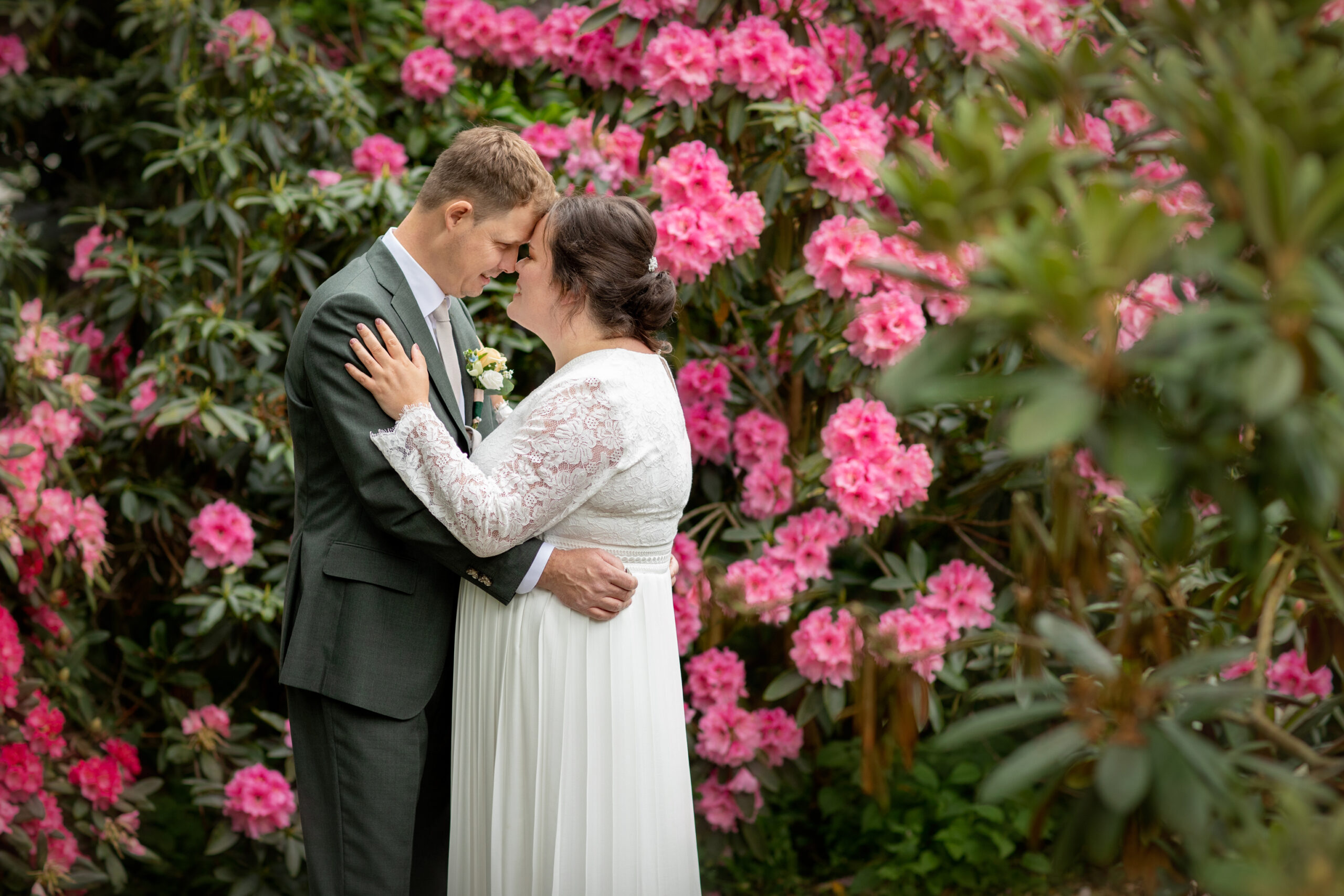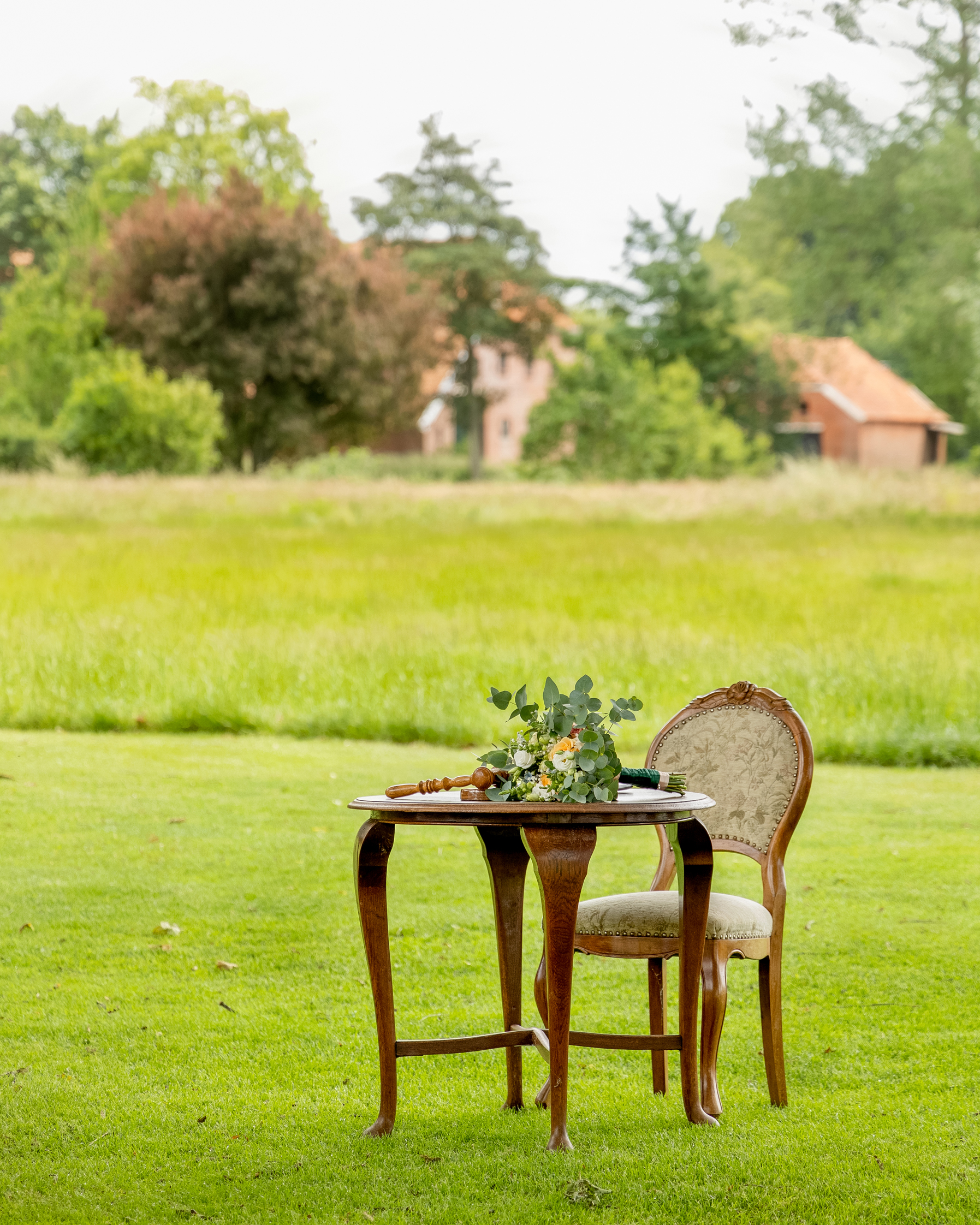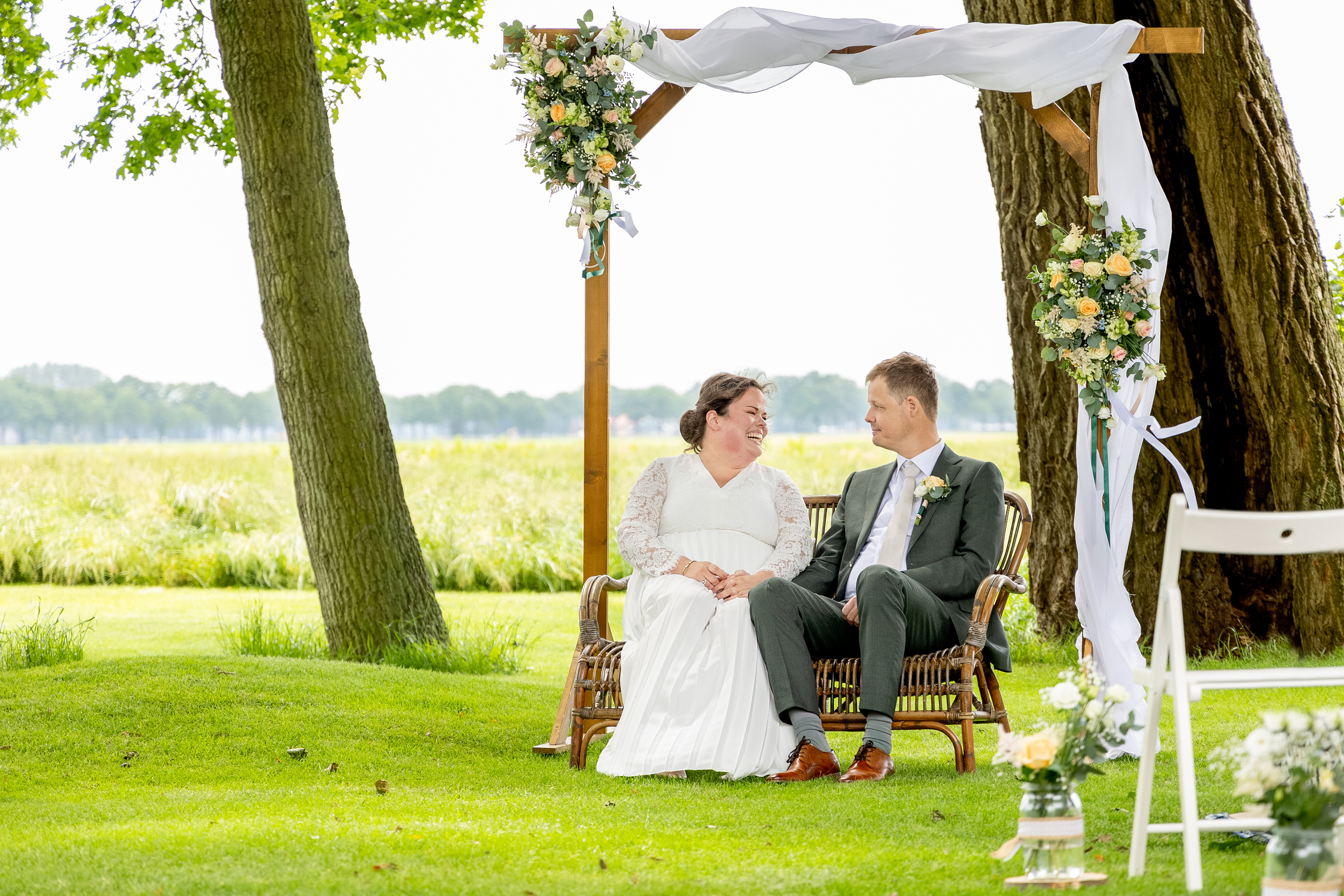 Midden tussen de landerijen in het hooikoortsseizoen! Je kon de hooikoortspatiënten er zo uitpikken, inclusief bruidegom en ondergetekende. 🙂 Gelukkig gingen we allemaal pas los met traanogen, loopneuzen en niesbuien na de huwelijksvoltrekking, taart & toost en familiefoto’s omdat de buurman toen begon met grasmaaien op het aangrenzende land. Voor mij het moment om in de auto te stappen omdat mijn taak erop zat en dit lieve bruidspaar en hun gezelschap achterliet op deze prachtige plek voor een fijn feest.