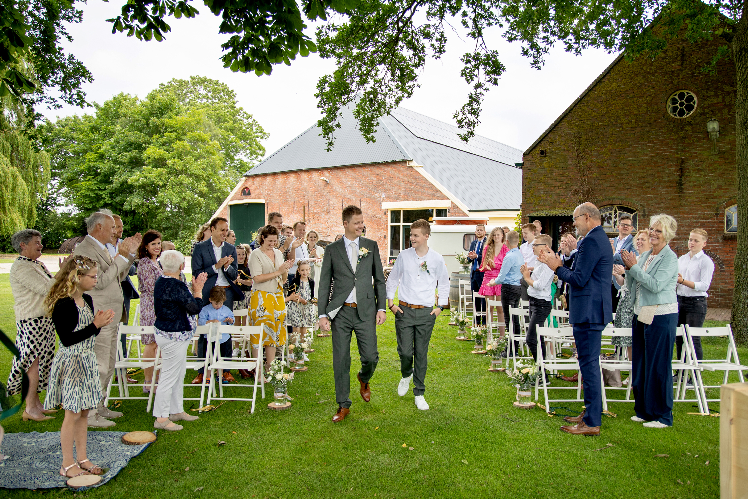 Arnaud & Ilse hadden elkaar nog niet gezien, een moment dat we bij hen in de tuin vastgelegd hebben. Hierna zijn we eerst met z’n drieën op pad gegaan voor de reportage in de Notaristuin In Eenrum. Na een tijdje sloten de kinderen zich bij ons aan en hebben we foto’s met z’n allen en van hen gemaakt. Na de reportage vertrokken we in de middag naar Boerderijcafé Mausel. Wat een prachtige locatie om elkaar het Ja woord te geven! Buiten onder de bomen midden tussen de landerijen was een sfeervolle opstelling gemaakt voor de huwelijksvoltrekking. Familie en vrienden stonden Arnaud & Ilse hier op te wachten. Een mooie ceremonie waar ook weer mooie rollen weggelegd waren voor de kinderen.