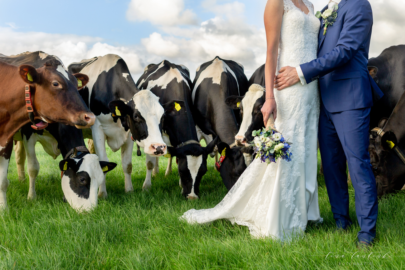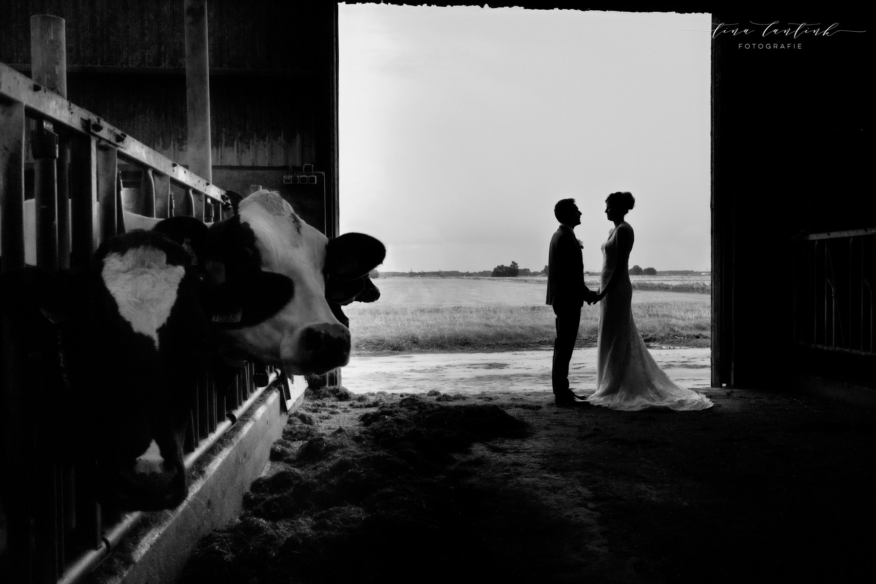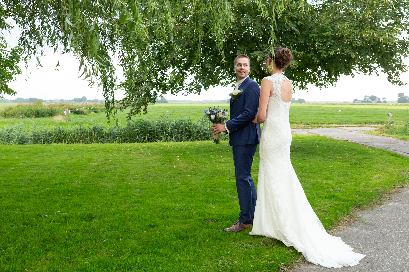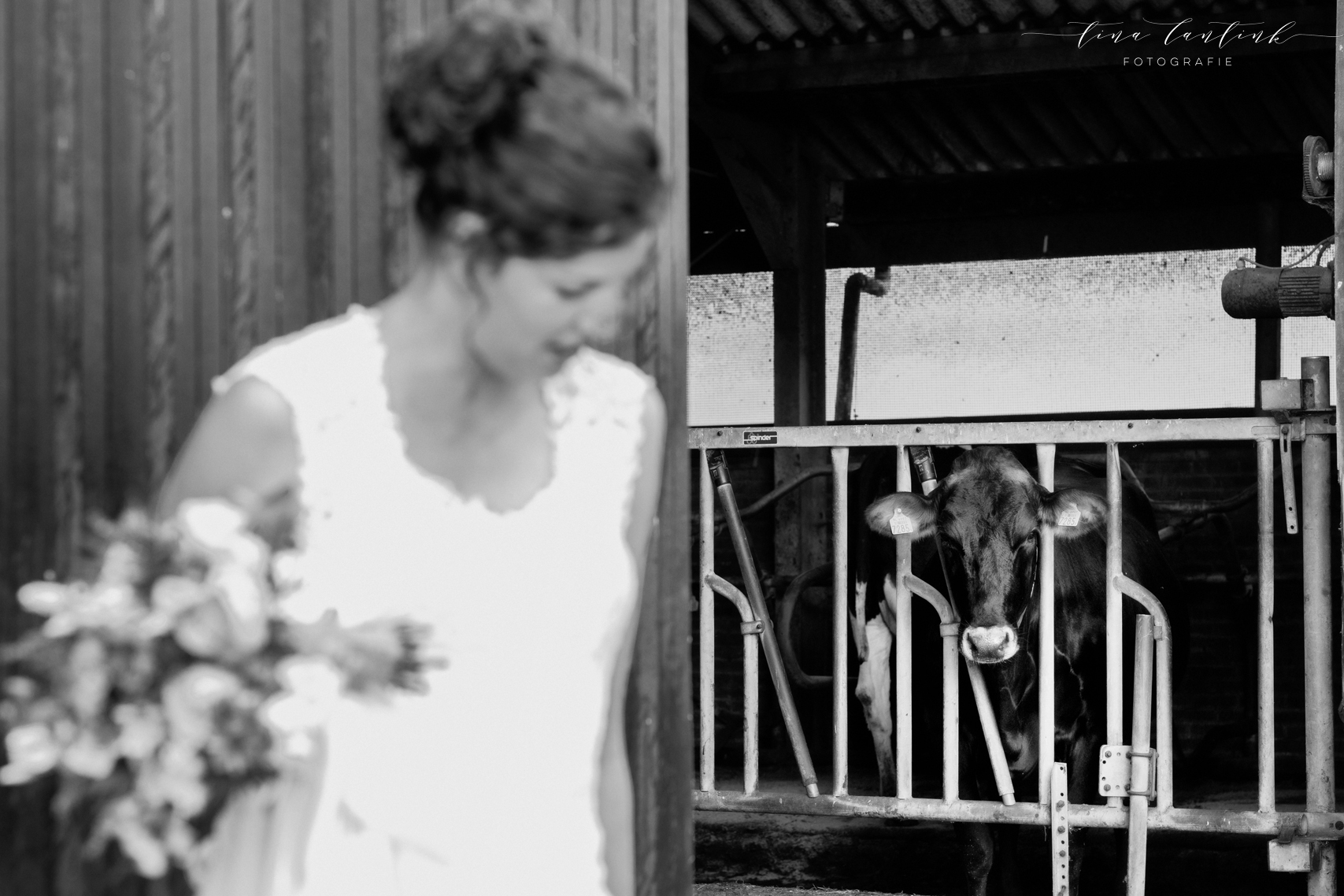 Vroeg in de ochtend begonnen we op de boerderij van Anouk & Jelle waar de bovenverdieping voor Jelle was en Anouk zich op de begane grond voorbereidde. Na de first look hebben we bij hen op de boerderij foto’s gemaakt. In het prachtige wijdse landschap, tussen de koeien en in de schuur. Koeien zijn sowieso prachtig, maar deze dames werken echt fantastisch mee, of niet helemaal, wat juist mooie plaatjes opleverde! En na een kop thee in de auto op weg naar Sneek. Hier komt Jelle vandaan en zijhouders wonen daar nog steeds op een boerderij. Ook daar hebben we foto’s kunnen maken voordat we naar het gemeentehuis van Sneek vertrokken. Een prachtig, sfeervol gemeentehuis. Mooie momenten waren er met oma die er door omstandigheden niet bij kon zijn maar door FaceTime toch een beetje bij was. Zoals gezegd echt een cadeautje deze dag, wat heerlijk om die mooie momenten weer te vangen, erbij te mogen zijn op zo’n dag en een mooie weergave hiervan te maken!