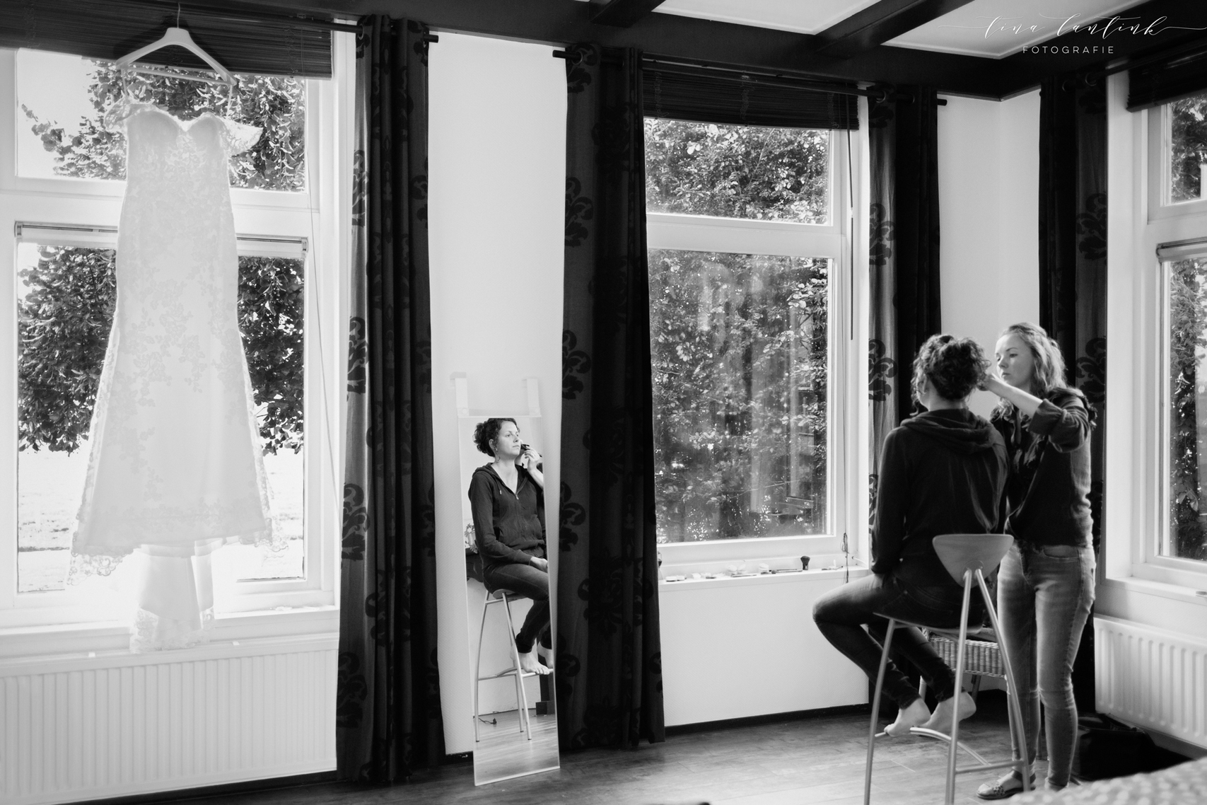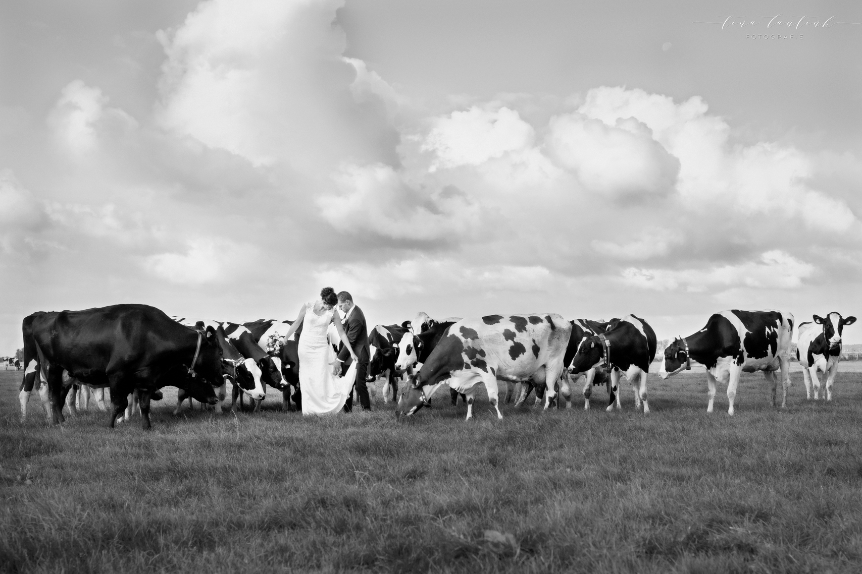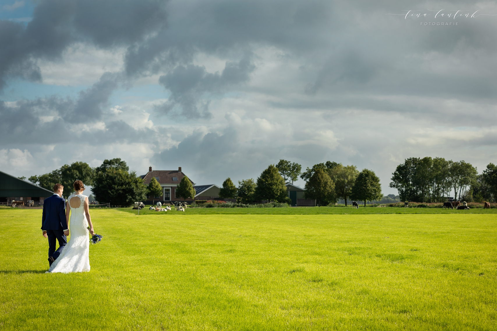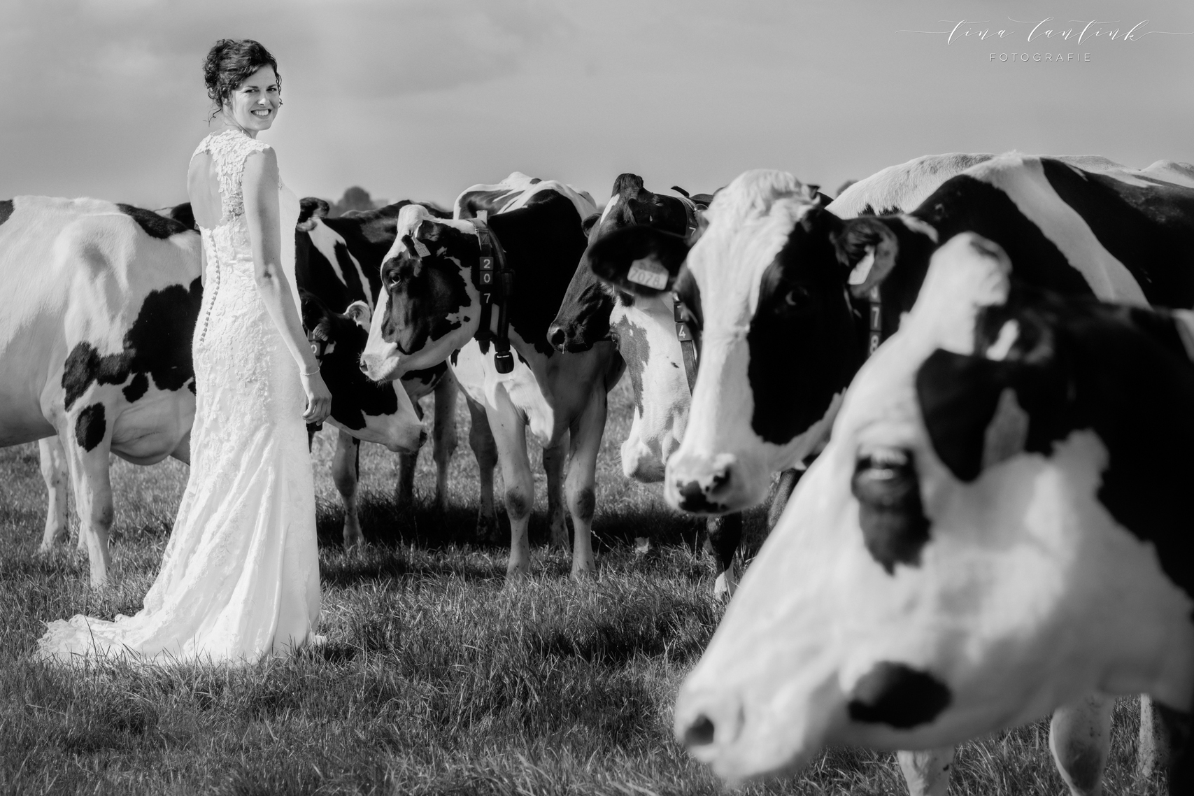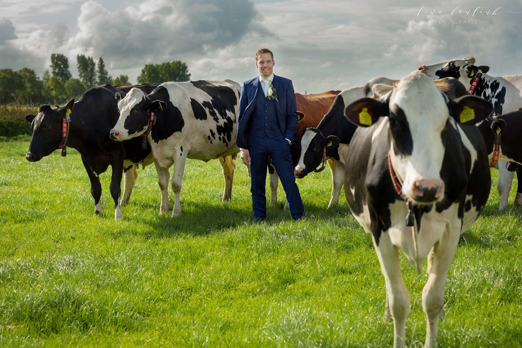 Vroeg in de ochtend begonnen we op de boerderij van Anouk & Jelle waar de bovenverdieping voor Jelle was en Anouk zich op de begane grond voorbereidde. Na de first look hebben we bij hen op de boerderij foto’s gemaakt. In het prachtige wijdse landschap, tussen de koeien en in de schuur. Koeien zijn sowieso prachtig, maar deze dames werken echt fantastisch mee, of niet helemaal, wat juist mooie plaatjes opleverde! En na een kop thee in de auto op weg naar Sneek. Hier komt Jelle vandaan en zijhouders wonen daar nog steeds op een boerderij. Ook daar hebben we foto’s kunnen maken voordat we naar het gemeentehuis van Sneek vertrokken. Een prachtig, sfeervol gemeentehuis. Mooie momenten waren er met oma die er door omstandigheden niet bij kon zijn maar door FaceTime toch een beetje bij was. Zoals gezegd echt een cadeautje deze dag, wat heerlijk om die mooie momenten weer te vangen, erbij te mogen zijn op zo’n dag en een mooie weergave hiervan te maken!