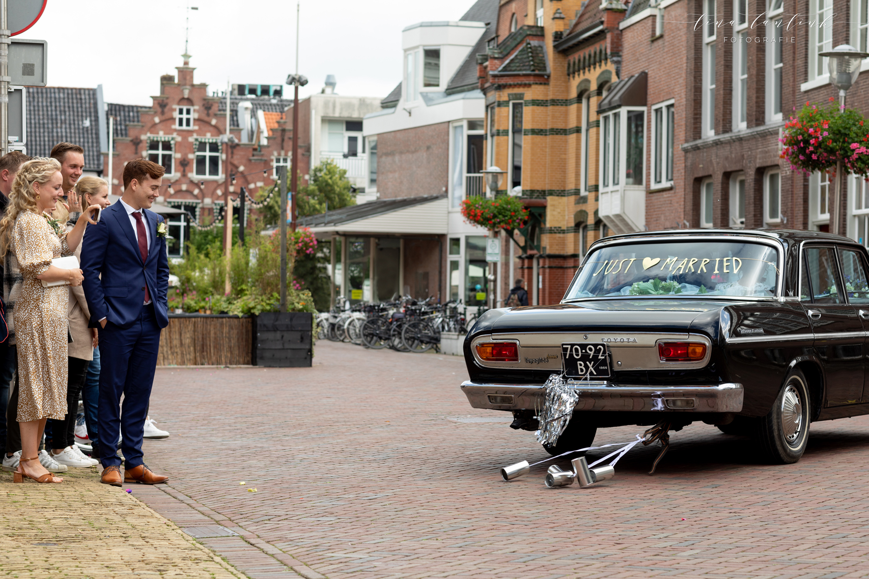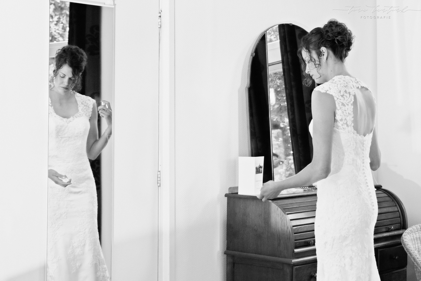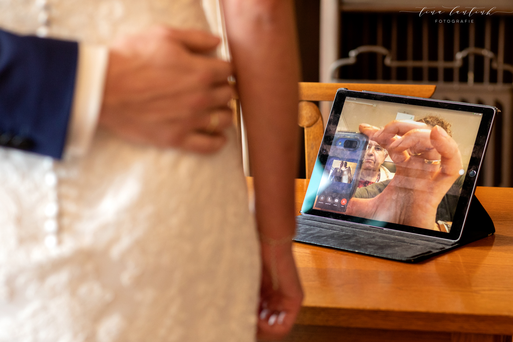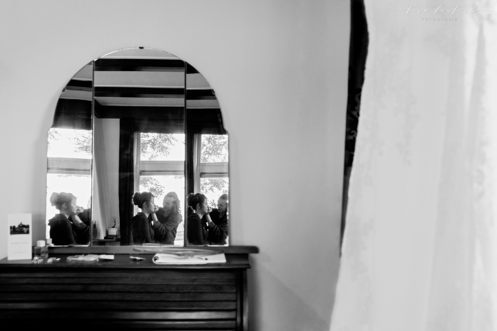 Vroeg in de ochtend begonnen we op de boerderij van Anouk & Jelle waar de bovenverdieping voor Jelle was en Anouk zich op de begane grond voorbereidde. Na de first look hebben we bij hen op de boerderij foto’s gemaakt. In het prachtige wijdse landschap, tussen de koeien en in de schuur. Koeien zijn sowieso prachtig, maar deze dames werken echt fantastisch mee, of niet helemaal, wat juist mooie plaatjes opleverde! En na een kop thee in de auto op weg naar Sneek. Hier komt Jelle vandaan en zijhouders wonen daar nog steeds op een boerderij. Ook daar hebben we foto’s kunnen maken voordat we naar het gemeentehuis van Sneek vertrokken. Een prachtig, sfeervol gemeentehuis. Mooie momenten waren er met oma die er door omstandigheden niet bij kon zijn maar door FaceTime toch een beetje bij was. Zoals gezegd echt een cadeautje deze dag, wat heerlijk om die mooie momenten weer te vangen, erbij te mogen zijn op zo’n dag en een mooie weergave hiervan te maken!