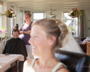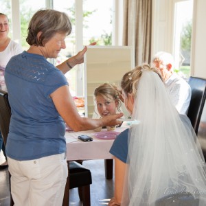 Afgelopen juli, op een op en top zomerse dag ging ik op weg voor de trouwreportage van Johan en Tineke. ’s Ochtends vroeg was ik al bij Tineke aanwezig om de voorbereidingen vast te leggen. In een gezellige sfeer samen met haar moeder en zus bereidde Tineke zich voor op haar trouwdag. Nadat haar, make-up gedaan was en haar jurk aan was was het wachten op Johan.