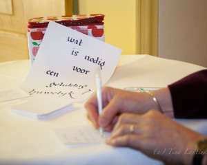 Na een heerlijke middag op de borg was het ’s avonds tijd voor de kerkdienst. Het muziekkorps waar Tineke in speelt speelde daar de liederen. Een prachtig geluid in deze mooie kerk. Naast het muziekkorps waren er ook een tante en een nicht die piano speelde en een lied voordroeg. Dit gaf de dienst een eigen en heel afwisselend karakter. Na de dienst weer gauw naar de borg waar de gasten van de receptie op het bruidspaar wachtten en waarna het feest los kon barsten.