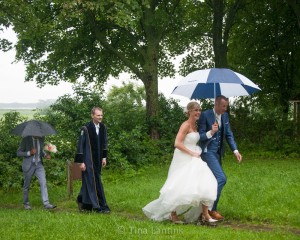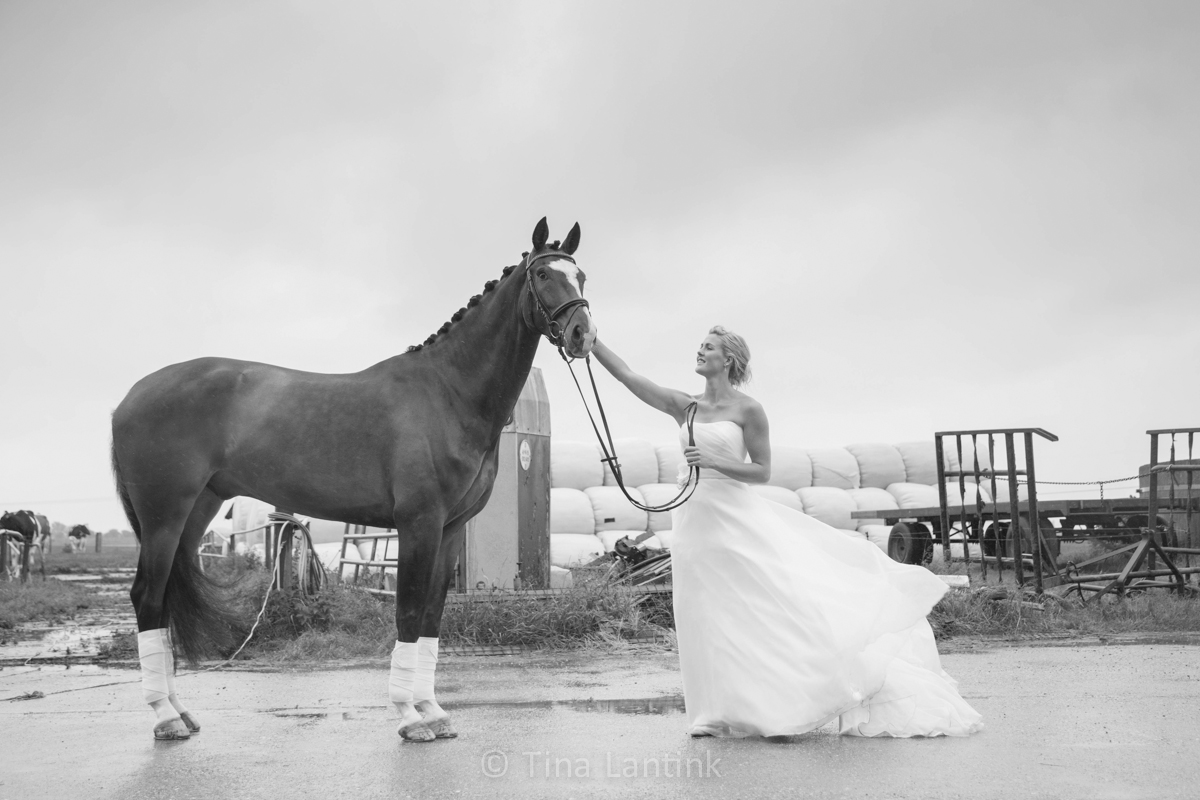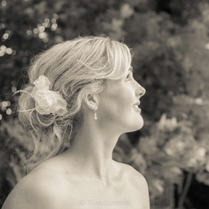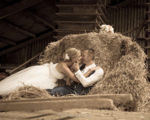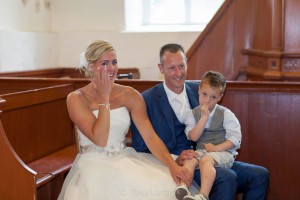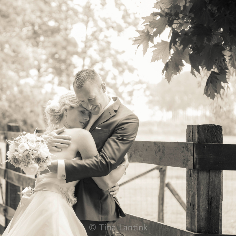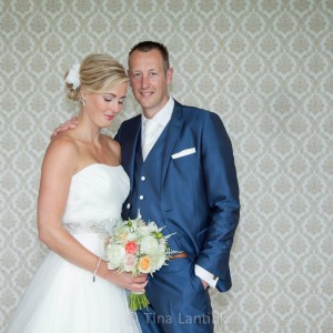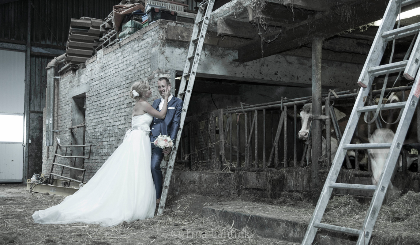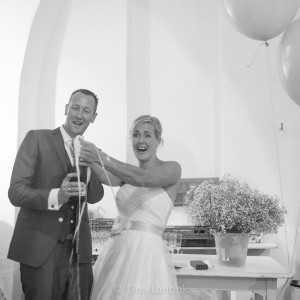 Balen? Héél even dan en dan doorgaan tot de orde van de dag. Twee hele positieve, verliefde en mooie mensen die zich niet door dit weer van de wijs lieten brengen. We zijn op de mooiste locaties geweest voor de foto’s. Waar je vaak qua ruimte wat beperkter bent als je op een binnenlocatie aangewezen bent kwam er hier geen einde aan de mooie plekjes. Het werk wat ze van de voorbereidingen gehad hadden kwam overal terug in de sfeer; in het kerkje van Oostum, thuis, op de feestlocatie. Alles was prachtig aangekleed met bloemen, kaarsjes, harten. En misschien wel juist doordat het zulk soepweer was en iedereen dus wel binnen moest blijven was het heel erg knus, intiem en gezellig. Ja, eigenlijk paste het precies bij datgene wat ze vooraf voor ogen hadden…