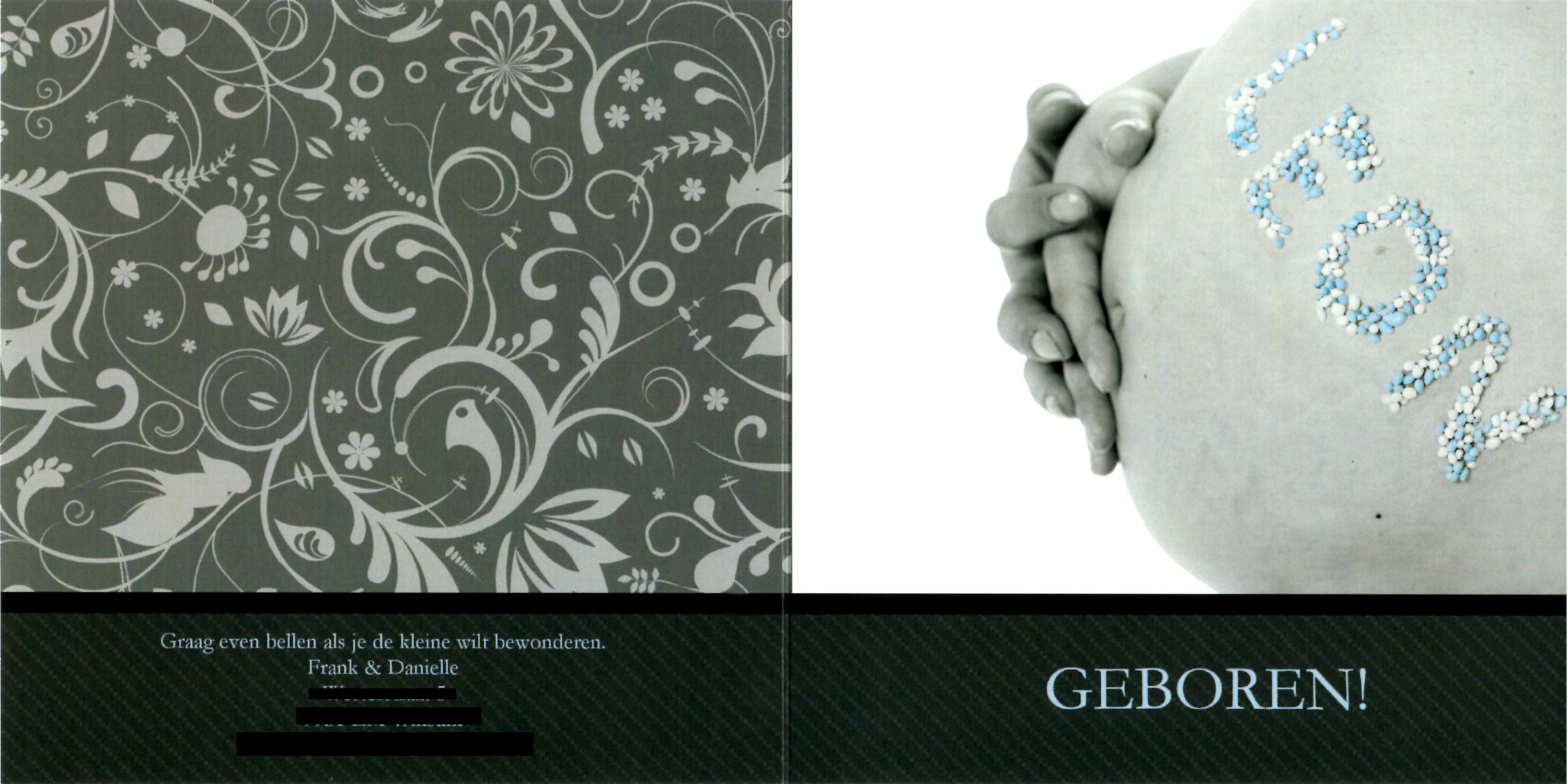 Na een shoot met veel lol vanwege het heerlijke kliederwerk met alle bovengenoemde ingredienten is dit de foto die uitgekozen wordt voor het geboortekaartje. En alles is net op tijd klaar want Leon dient zich wat eerder aan. Wat is het vervolgens leuk om de door mij gemaakt foto op een kaartje terug te zien die geheel door Frank & Danielle is ontworpen met de vrolijke tekst: