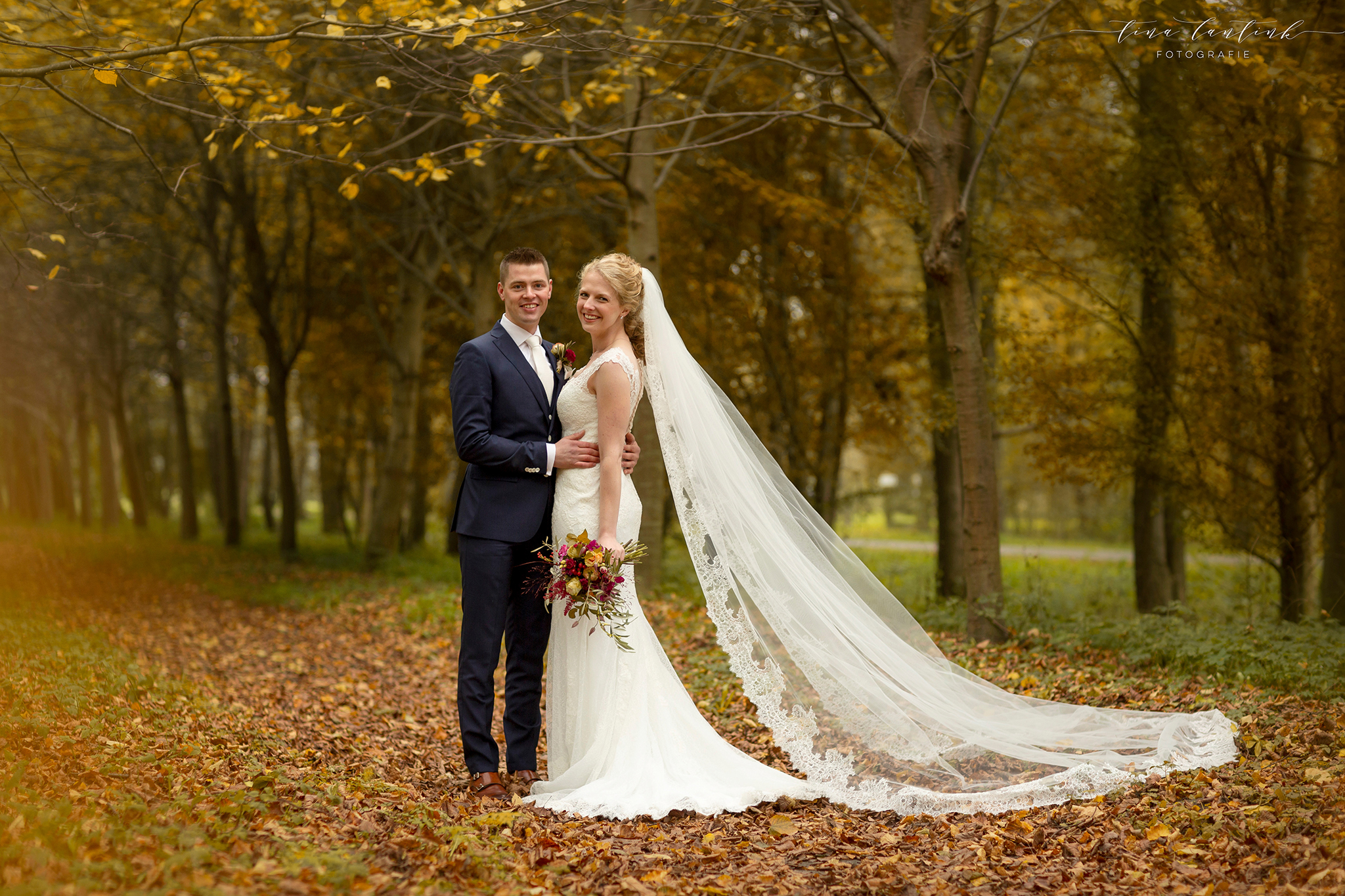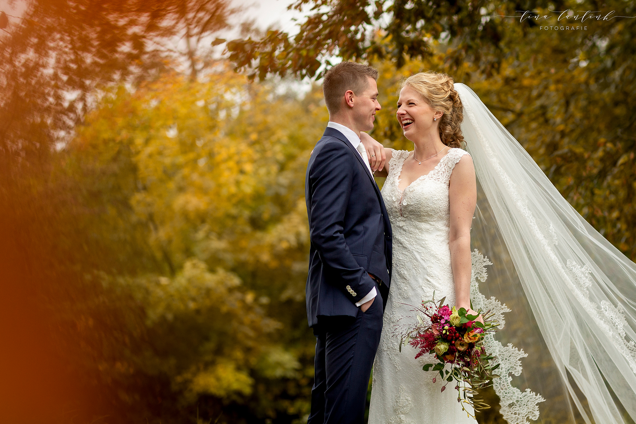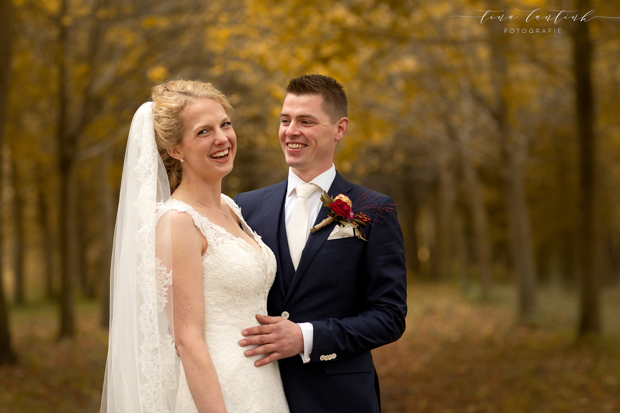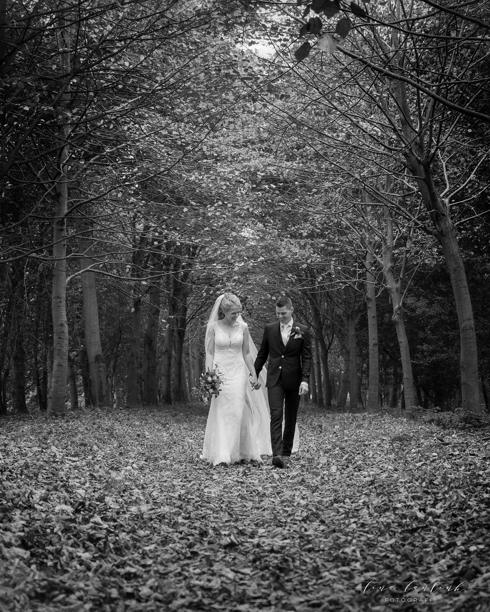 Na wat heen en weer pendelen tijdens zonsopgang tussen de boerderij waar Martinus zich voorbereidde en de boerderij waar Marianne was om de voorbereidingen vast te leggen was het moment daar waarop ze elkaar voor het eerst mochten zien en we vervolgens op locatie foto’s gingen maken. De trouwauto kwam niet opdagen, maar een belletje met vrienden en er kwam een geweldig alternatief voorrijden. Het was koud, heel erg koud. Reden te meer om ze lekker dicht tegen elkaar aan te laten poseren. Maar het was ook herfst, en herfst heeft prachtige kleuren wat weer een hoop goed maakte. Naast dat de schuur prachtig versierd was was het er ook lekker warm en zo konden we allemaal met soep, wat ook weer verzorgd werd door familie en vrienden, weer lekker op temperatuur komen na de reportage en voor de huwelijksvoltrekking. Het was een hele mooie dag, ondanks kou en veel regen later op de dag. Maar het was warm namelijk doordat de vriendschap en familiebanden overal doorheen te voelen waren. In de voorbereiding, tijdens de dag zelf, en ik weet zeker dat ze de dag erna ook weer allemaal klaar stonden om te helpen opruimen… <3
