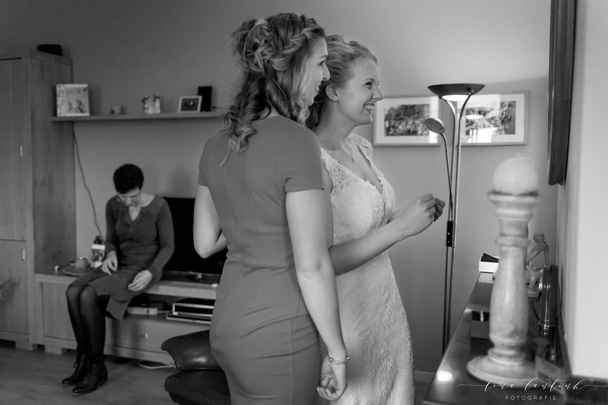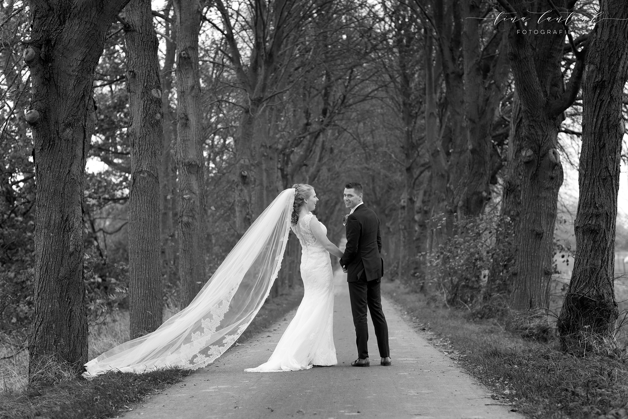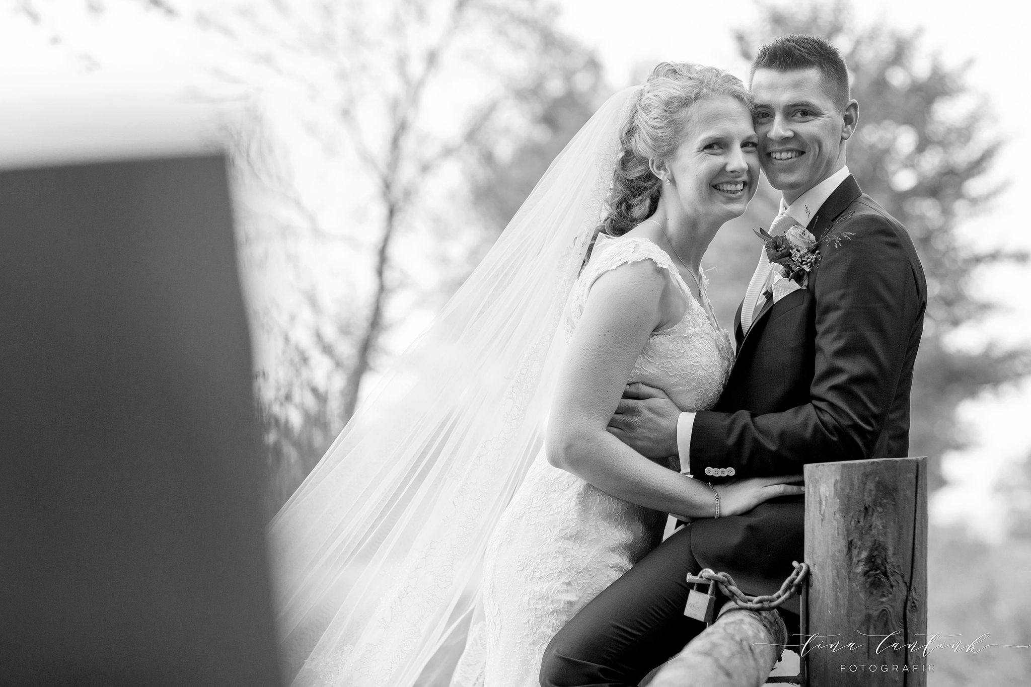 Na wat heen en weer pendelen tijdens zonsopgang tussen de boerderij waar Martinus zich voorbereidde en de boerderij waar Marianne was om de voorbereidingen vast te leggen was het moment daar waarop ze elkaar voor het eerst mochten zien en we vervolgens op locatie foto’s gingen maken. De trouwauto kwam niet opdagen, maar een belletje met vrienden en er kwam een geweldig alternatief voorrijden. Het was koud, heel erg koud. Reden te meer om ze lekker dicht tegen elkaar aan te laten poseren. Maar het was ook herfst, en herfst heeft prachtige kleuren wat weer een hoop goed maakte. Naast dat de schuur prachtig versierd was was het er ook lekker warm en zo konden we allemaal met soep, wat ook weer verzorgd werd door familie en vrienden, weer lekker op temperatuur komen na de reportage en voor de huwelijksvoltrekking. Het was een hele mooie dag, ondanks kou en veel regen later op de dag. Maar het was warm namelijk doordat de vriendschap en familiebanden overal doorheen te voelen waren. In de voorbereiding, tijdens de dag zelf, en ik weet zeker dat ze de dag erna ook weer allemaal klaar stonden om te helpen opruimen… <3