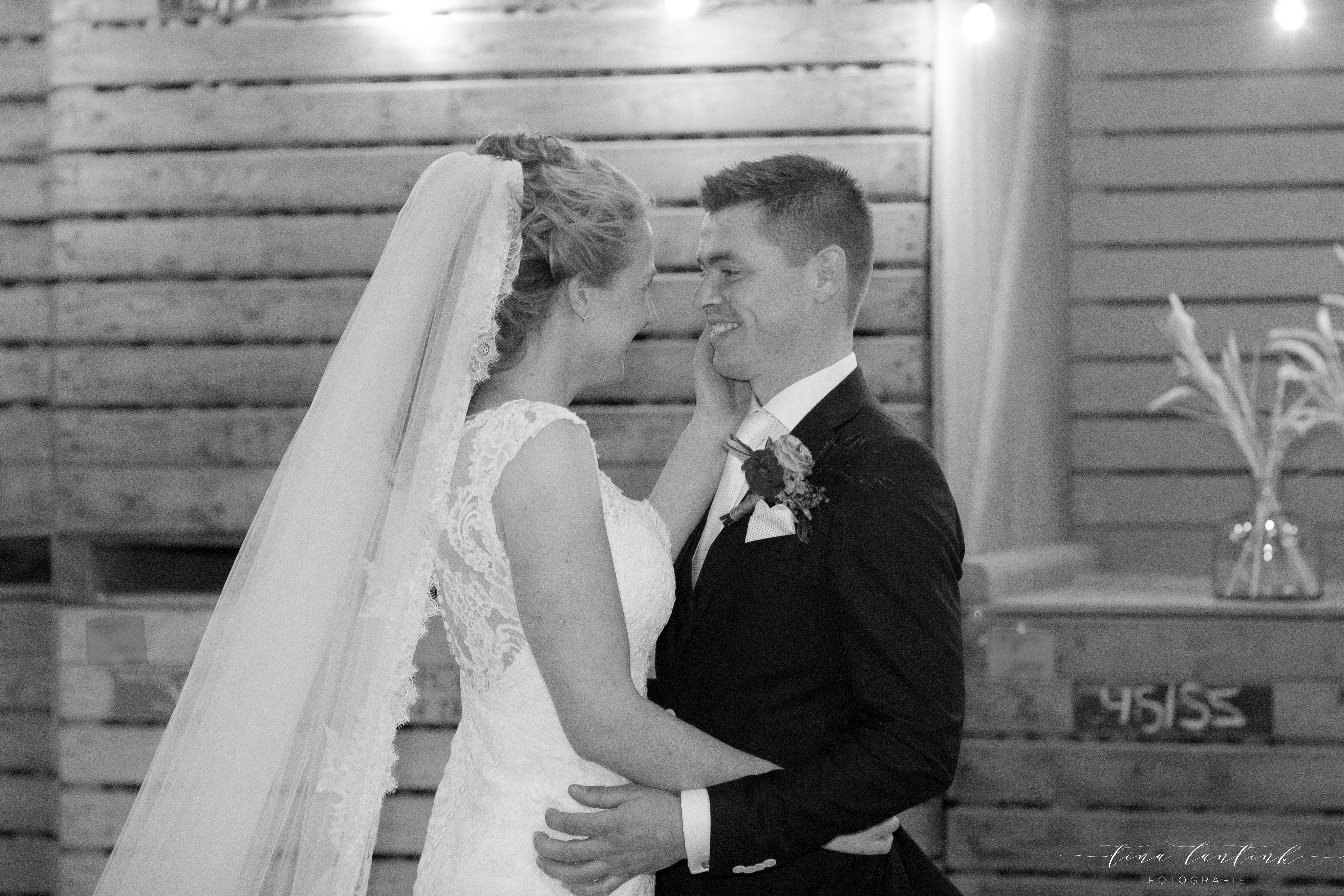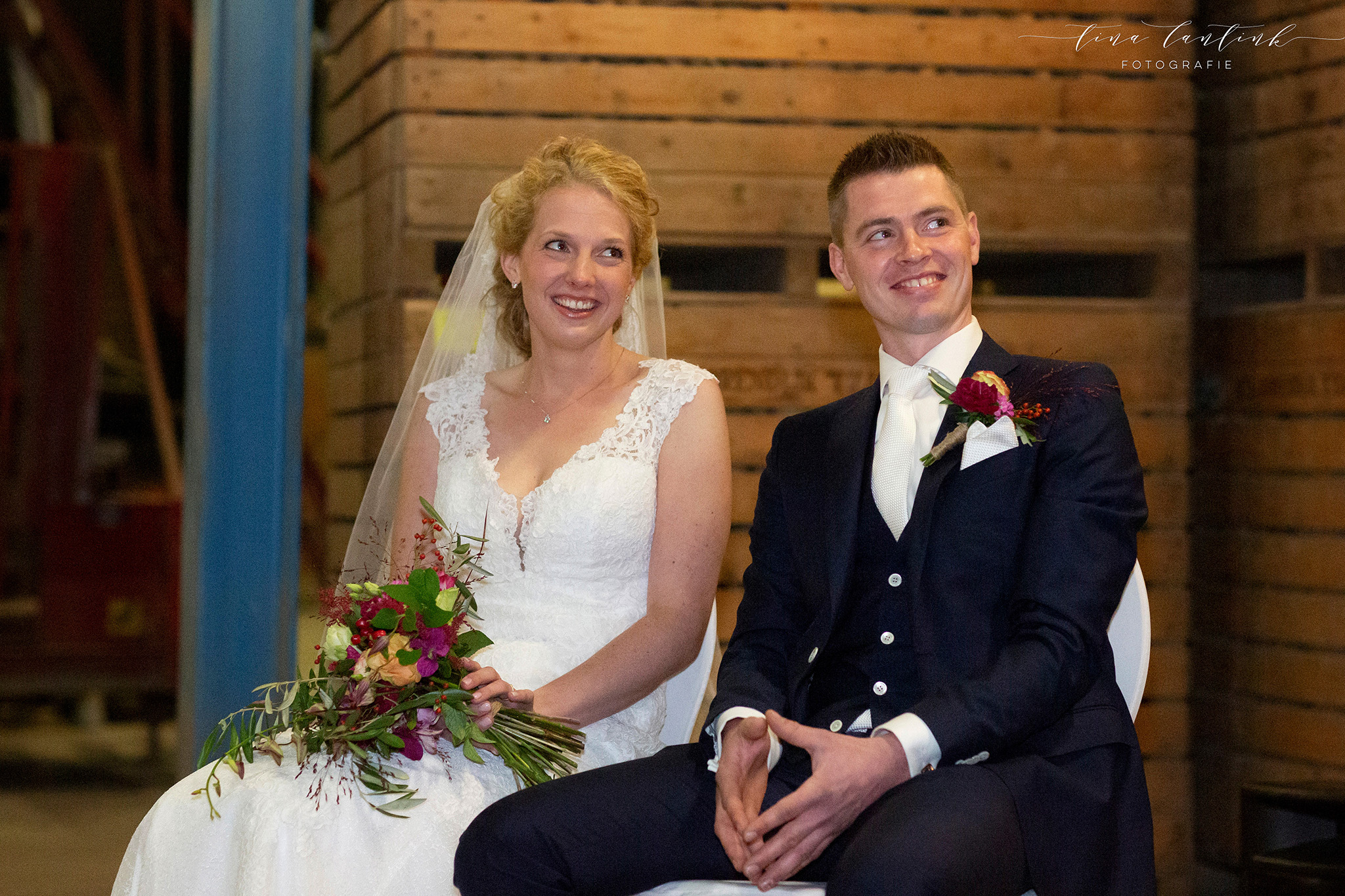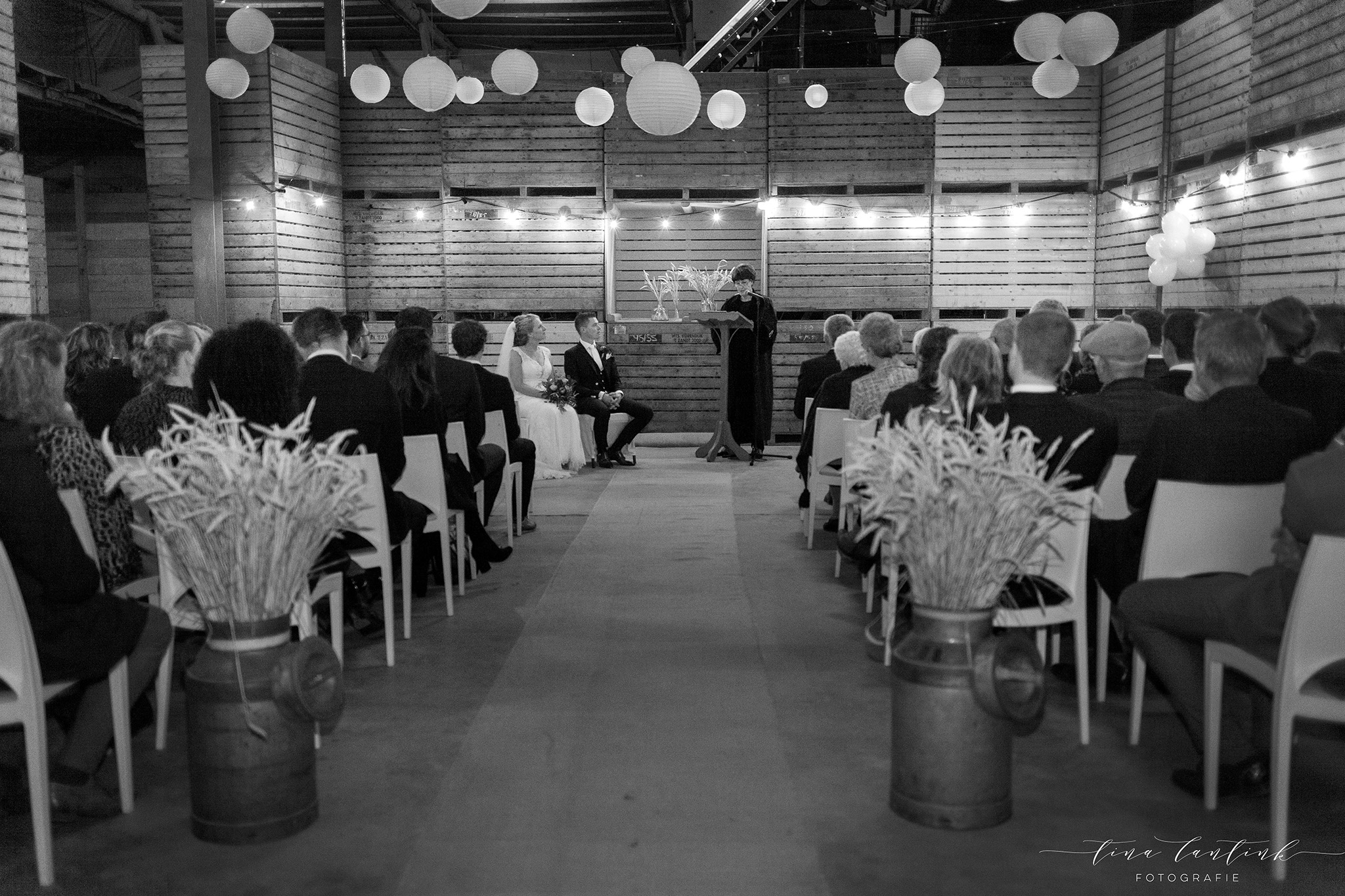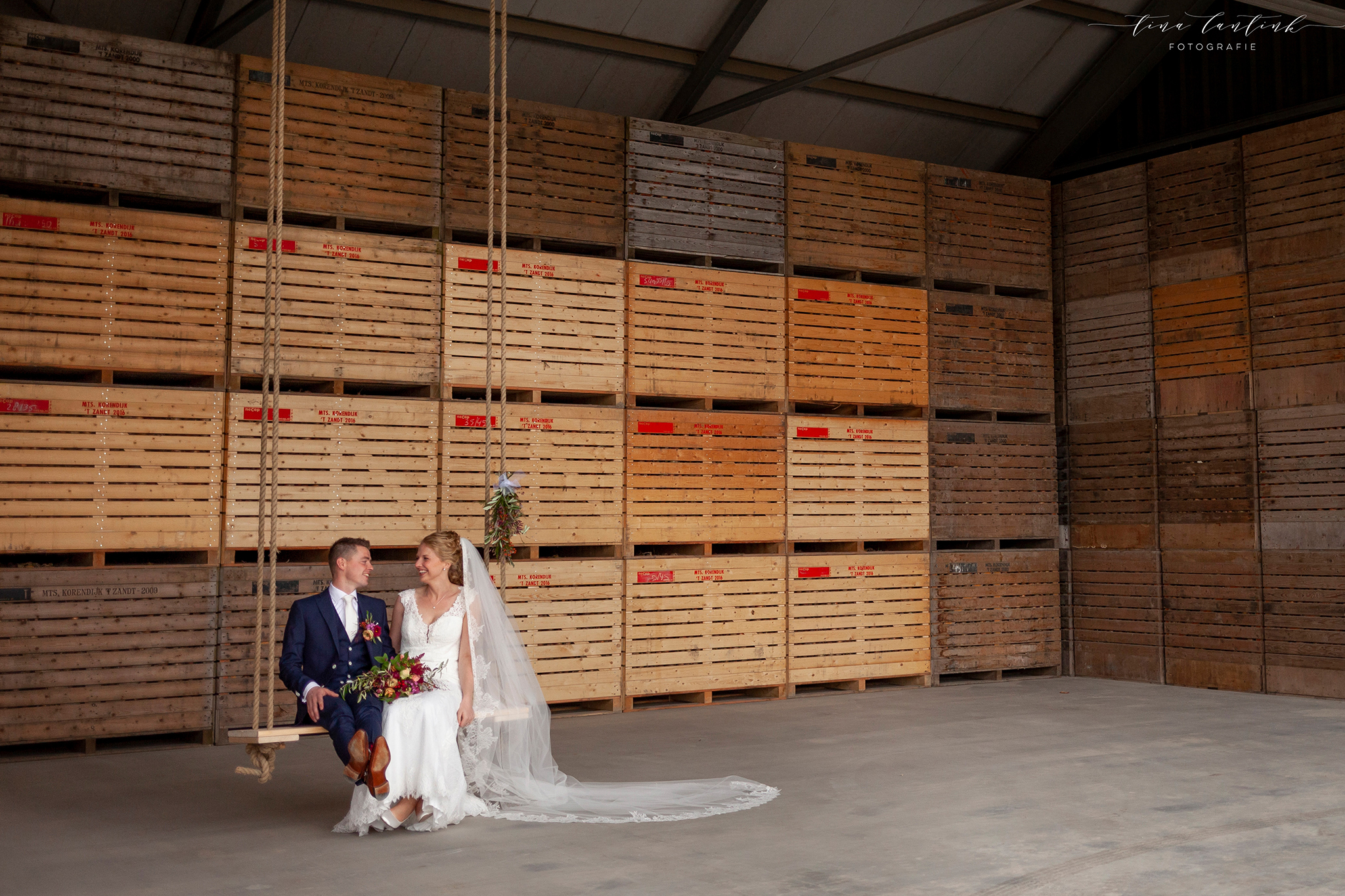 1 november 2019, de dag waarop Marianne & Martinus “Ja” tegen elkaar zeiden. De dagen worden snel korter, het weer wordt wat guurder, de aardappels moeten van het land… Vooral dat laatste was erg belangrijk. Niet alleen vanwege de omslag in de seizoenen, maar ook vanwege de trouwlocatie. Marianne & Martinus komen beide van de boerderij. Het hoort bij hen, Martinus is boer. En als het dan zo eigen is, wat is er dan mooier om op de boerderij te trouwen?! Toen ze dat vooraf vertelden was ik vooral nieuwsgierig naar het “hoe dan?”. Toen ik die dag aankwam op de boerderij was ik vooral heel erg onder de indruk. Wát een sfeer hebben zij weten te creëren in de schuur! Tussen de aardappelkisten die met veel hulp van familie en vrienden nog tot diep in de nacht gevuld werden, was een geweldige trouwlocatie gecreëerd. Witte stoeltjes, bloemen, sfeerverlichting, tafeltjes, een schommel met bloemen,…… In één woord geweldig!