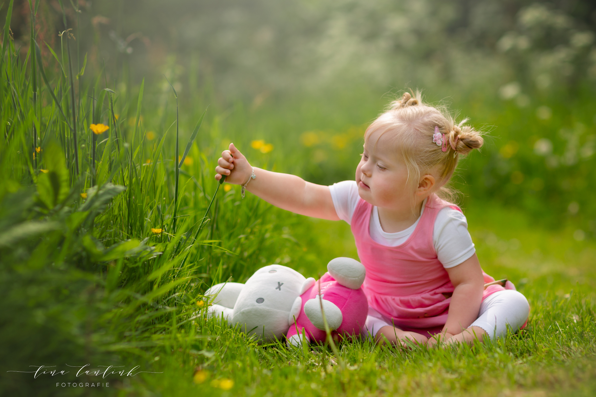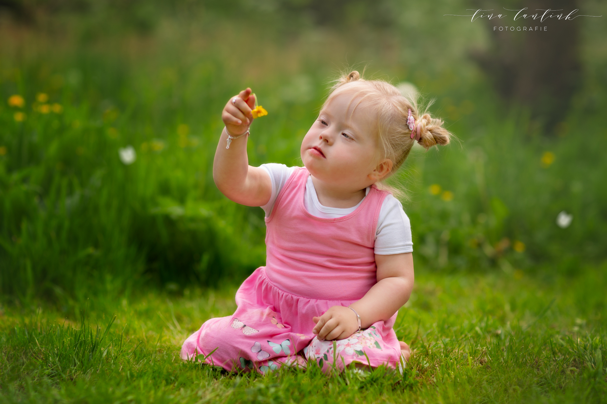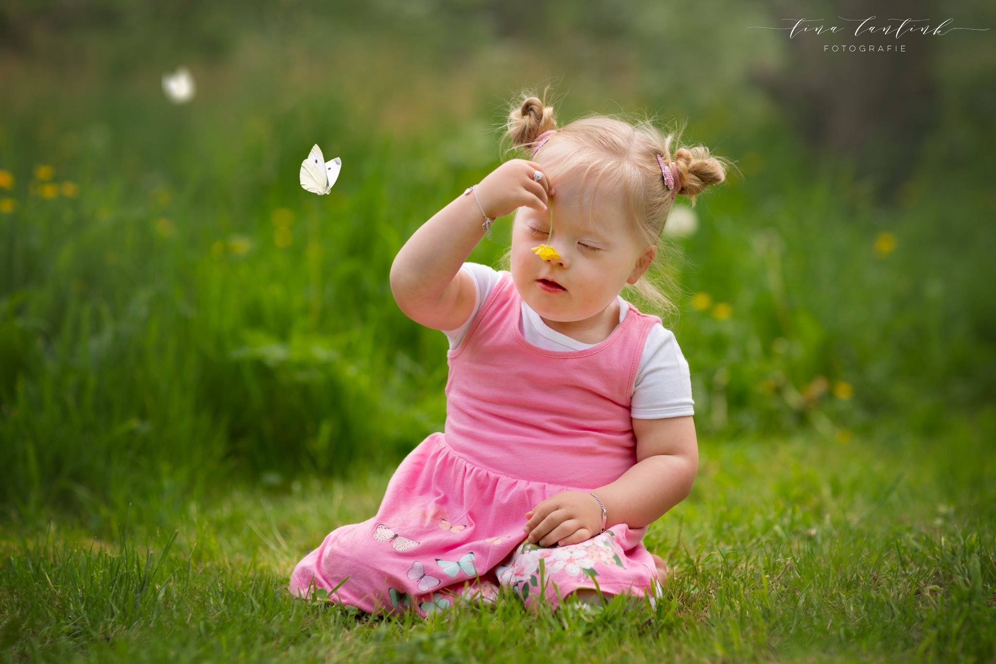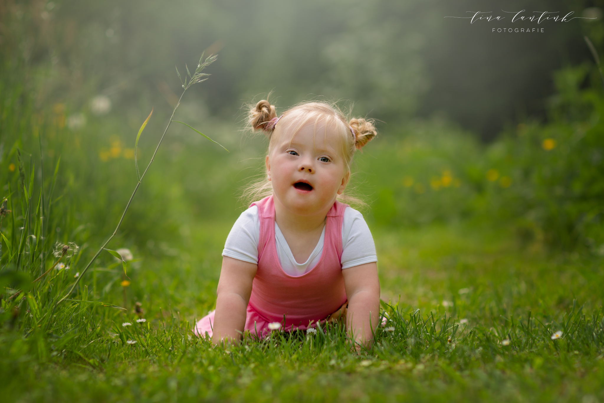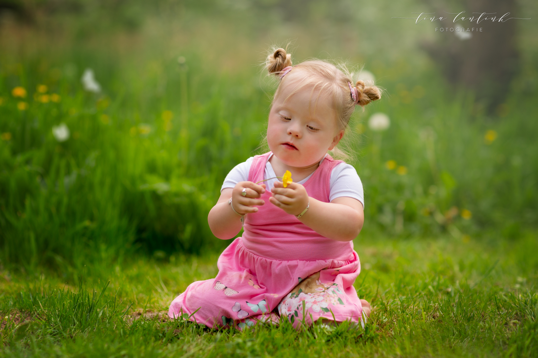 Laatst kwam ik de foto’s van vorig jaar weer tegen en met het verhaal van Tessa in mijn hoofd heb ik contact opgenomen met haar. Of ik misschien nog een fotoshoot van Britt zou mogen maken? “Britt straalt in de natuur,” zei ze vorig jaar. Hoe mooi zou het dan zijn wanneer we Britt meenemen de natuur in wanneer deze volop in bloei staat? Dat leek haar erg leuk. Zo zijn we een paar weken geleden naar de Allersmaborg gegaan waar de fluitenkruid en boterbloemen volop bloeiden in het hoge gras. “Britt blijft wel op haar plek zitten hoor. Van een nieuwe omgeving is ze vaak erg onder de indruk…” Niet dus! ? Hoe mooi was dat! Tessa en ik zaten/lagen op de grond en Britt ging helemaal op in de natuur om haar heen. Het was geweldig, soms ook gewoon ontroerend, om te zien hoe zij de wereld om haar heen aan het verkennen was.