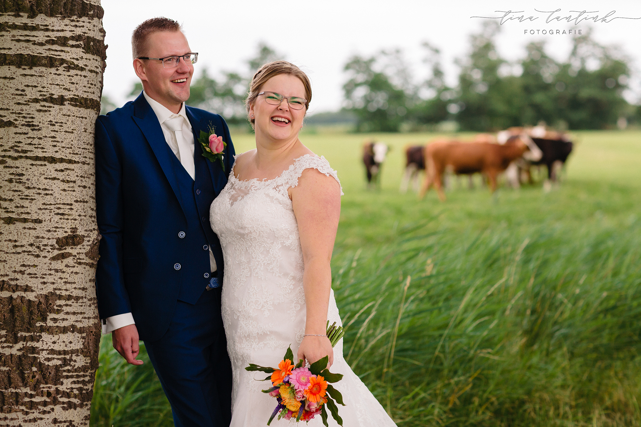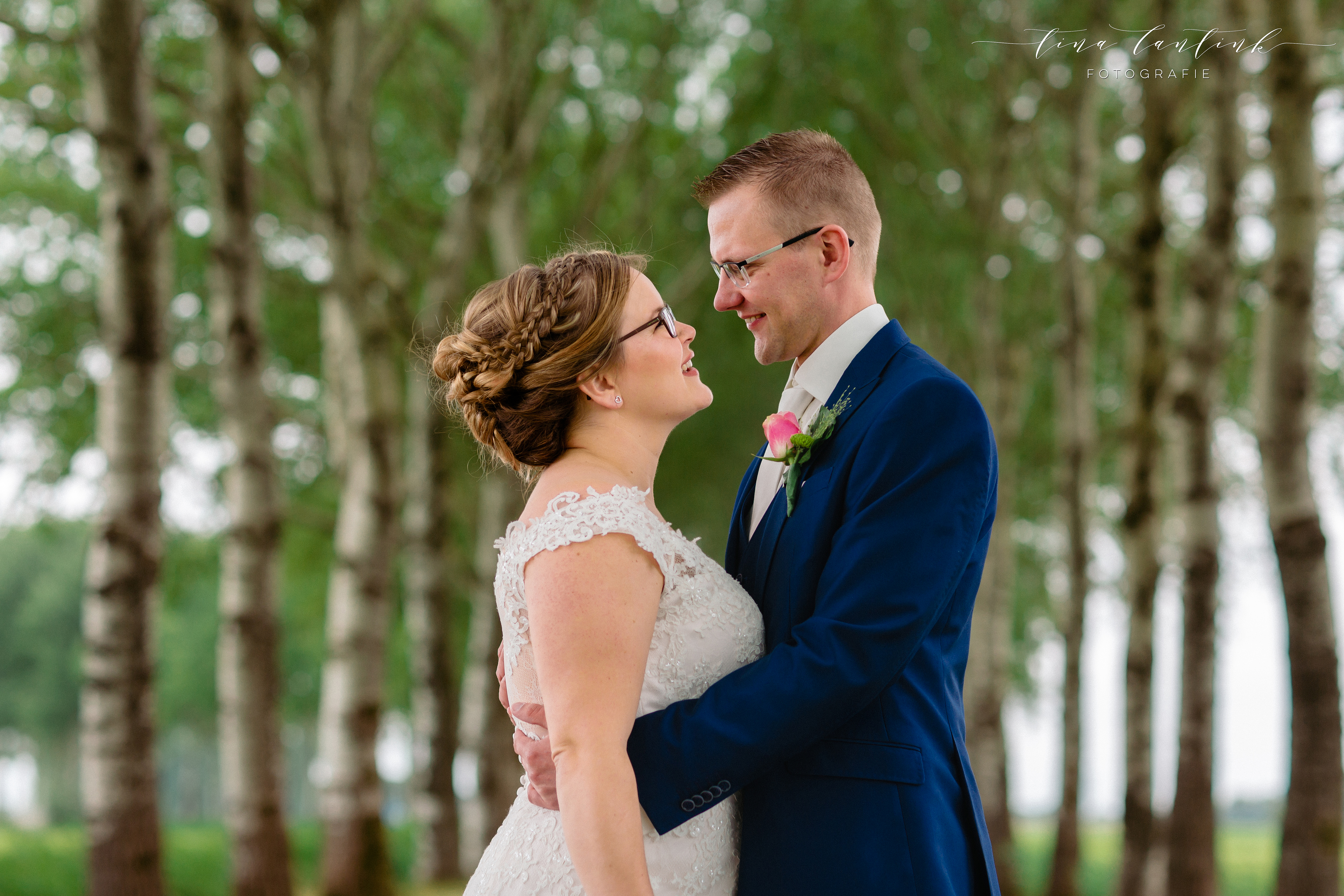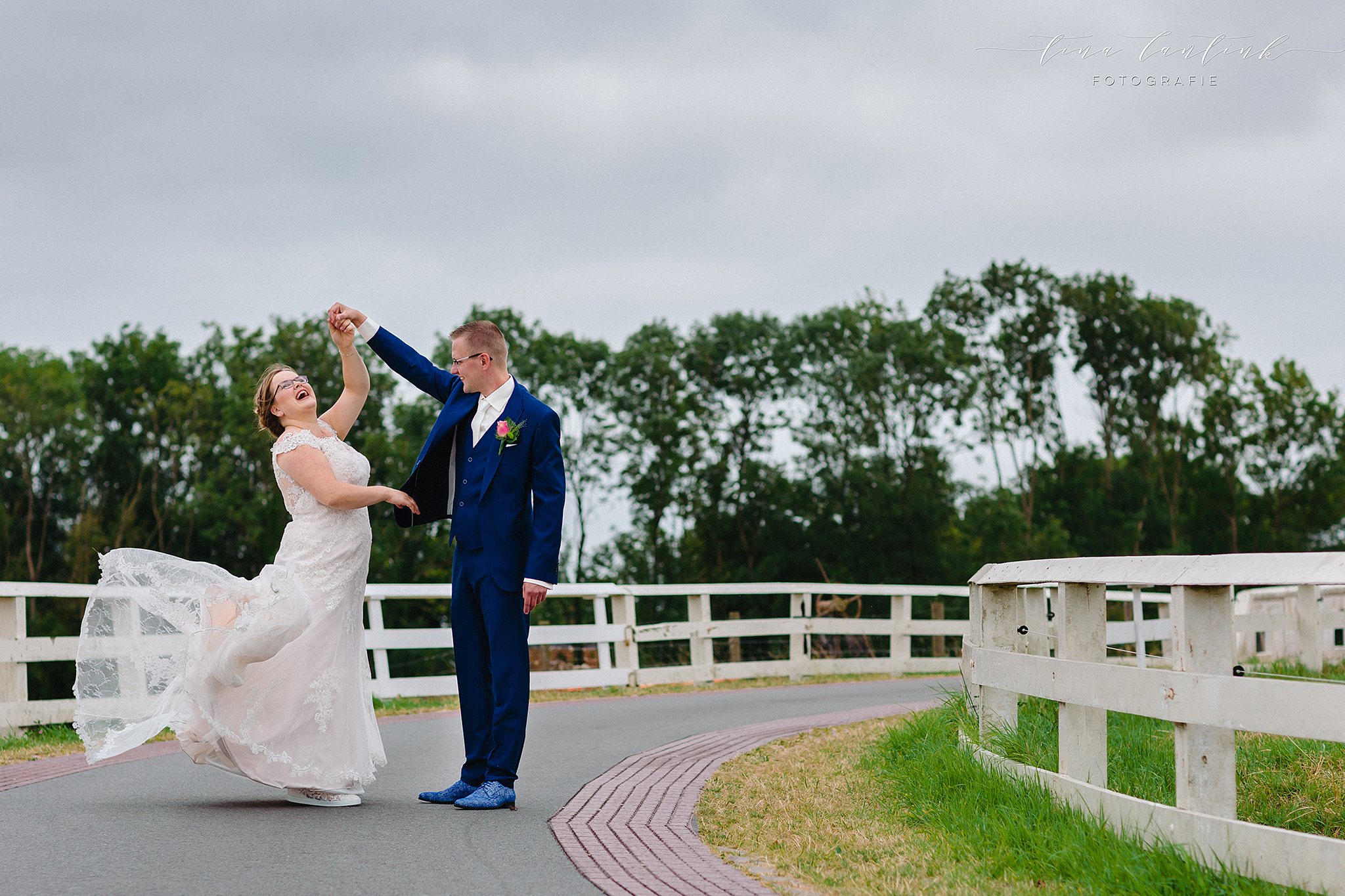 Het leuke was dat Petra & Sieger allebei van elkaar niet wisten wat ze zouden dragen deze dag. Dat maakt de eerste blik nog zo veel leuker bij een bruidspaar. Na deze verrassing bij de voordeur onder het toeziend oog van veel familie en vrienden zijn wij samen op pad gegaan voor de reportage. Sightseeing Reitdiepdal! Rondrijden en stoppen op leuke plekken om foto’s te maken. Het Reitdiepdal is sowieso prachtig en als je er ‘iets’ mee hebt zoals vooral Sieger dat heeft dan geeft het alleen maar meer een eigen draai en vertrouwd gevoel om daar de foto’s te maken. En Petra? Petra is wellicht de meest goedlachse bruid die ik ooit heb gefotografeerd. Wat een lol kun je met haar hebben. Het spat echt van hun reportage af. Zowel op de dag zelf als tijdens het bewerken en samenstellen van het album verscheen er weer een glimlach op mijn gezicht bij haar lachbuien. 🙂