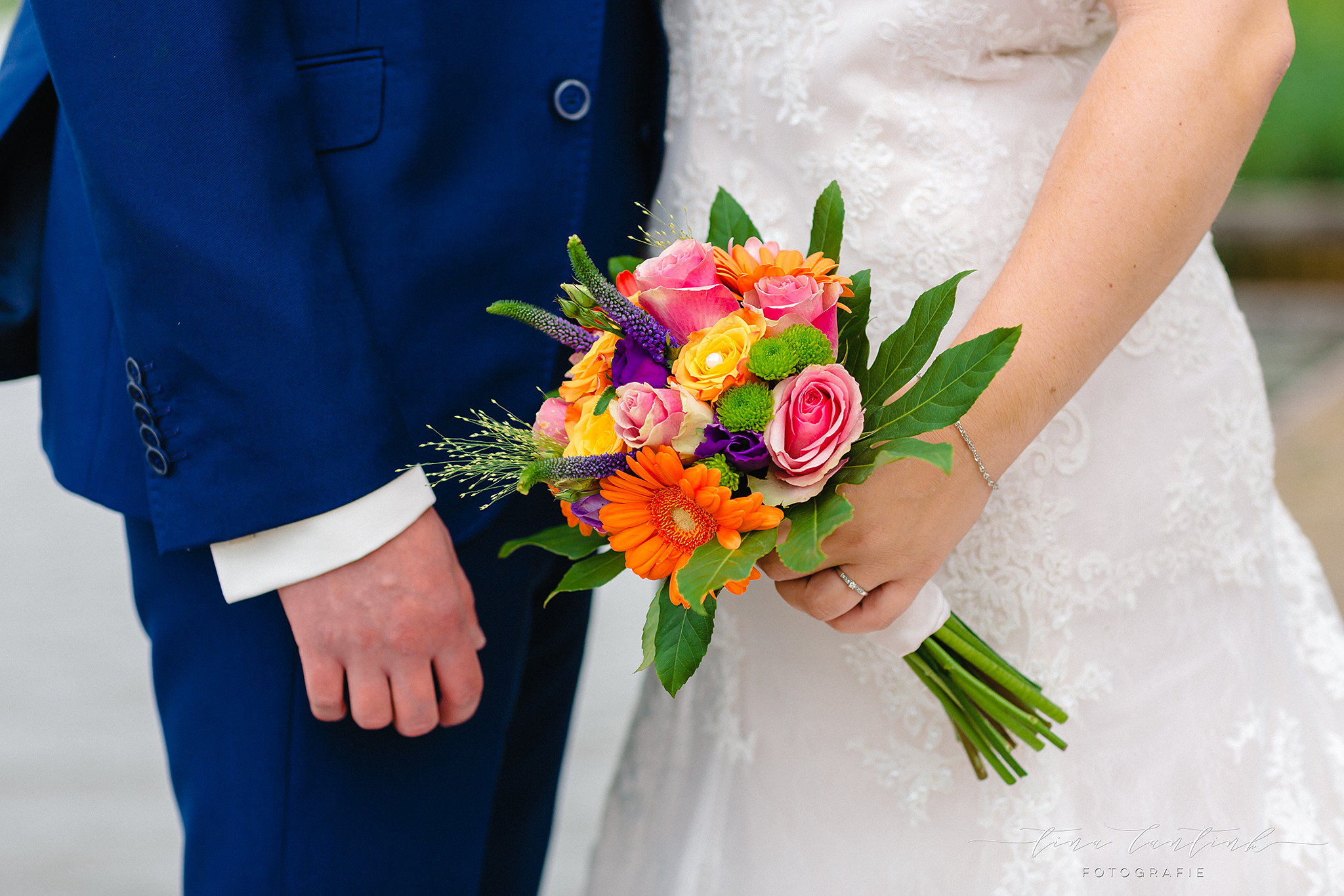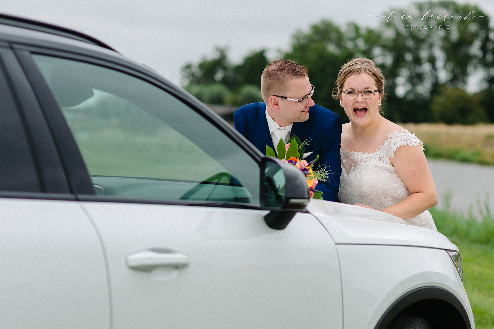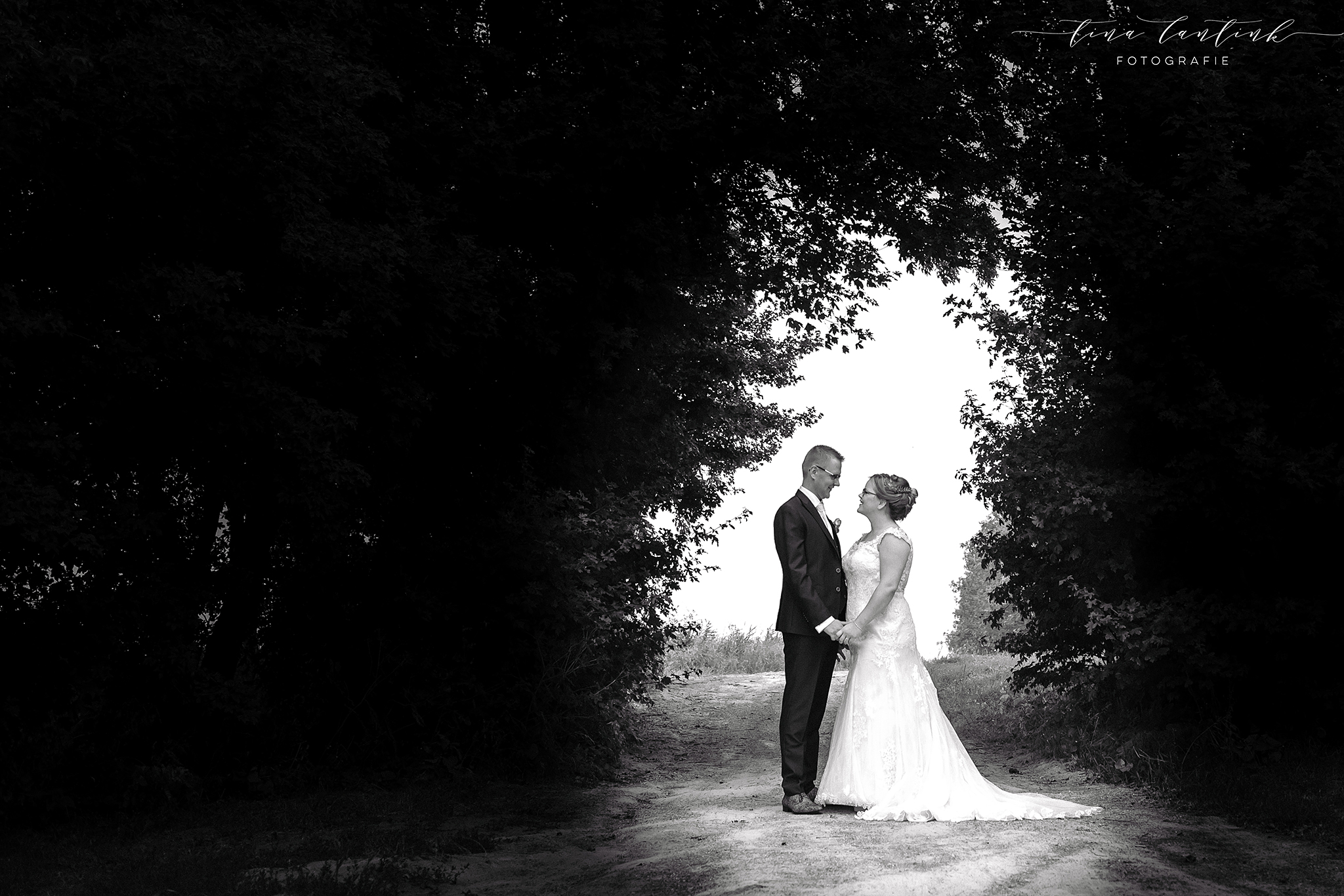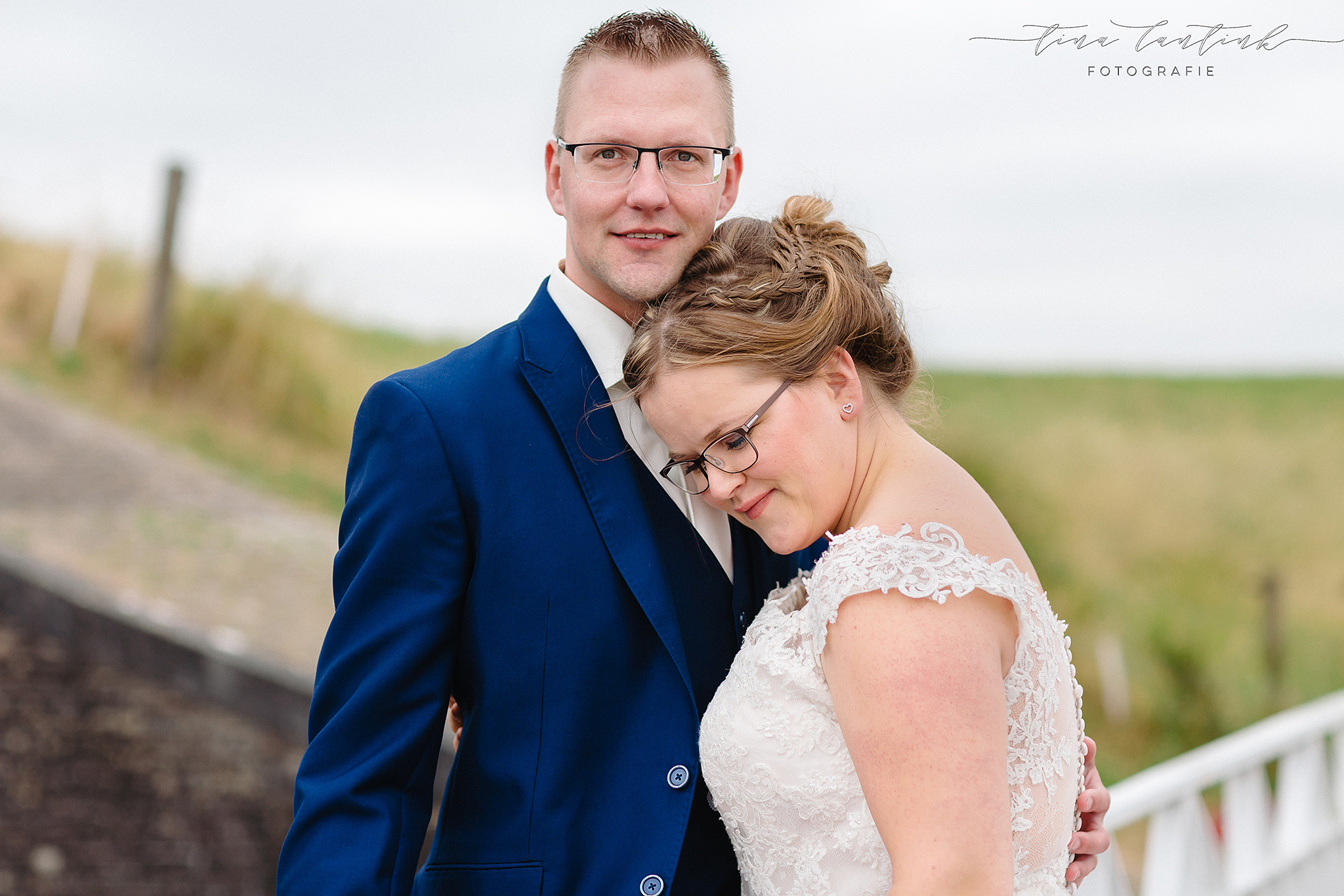 Het leuke was dat Petra & Sieger allebei van elkaar niet wisten wat ze zouden dragen deze dag. Dat maakt de eerste blik nog zo veel leuker bij een bruidspaar. Na deze verrassing bij de voordeur onder het toeziend oog van veel familie en vrienden zijn wij samen op pad gegaan voor de reportage. Sightseeing Reitdiepdal! Rondrijden en stoppen op leuke plekken om foto’s te maken. Het Reitdiepdal is sowieso prachtig en als je er ‘iets’ mee hebt zoals vooral Sieger dat heeft dan geeft het alleen maar meer een eigen draai en vertrouwd gevoel om daar de foto’s te maken. En Petra? Petra is wellicht de meest goedlachse bruid die ik ooit heb gefotografeerd. Wat een lol kun je met haar hebben. Het spat echt van hun reportage af. Zowel op de dag zelf als tijdens het bewerken en samenstellen van het album verscheen er weer een glimlach op mijn gezicht bij haar lachbuien. 🙂