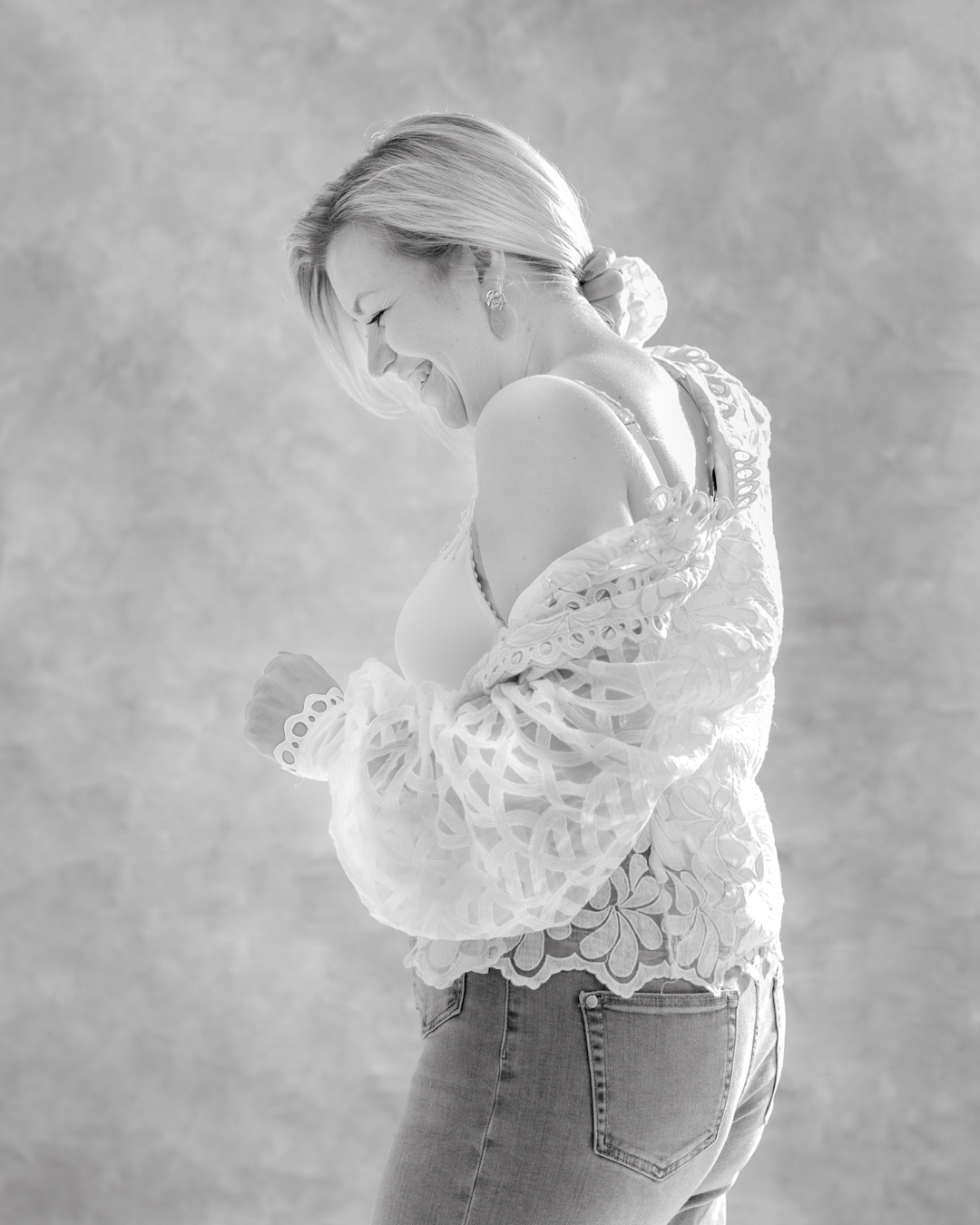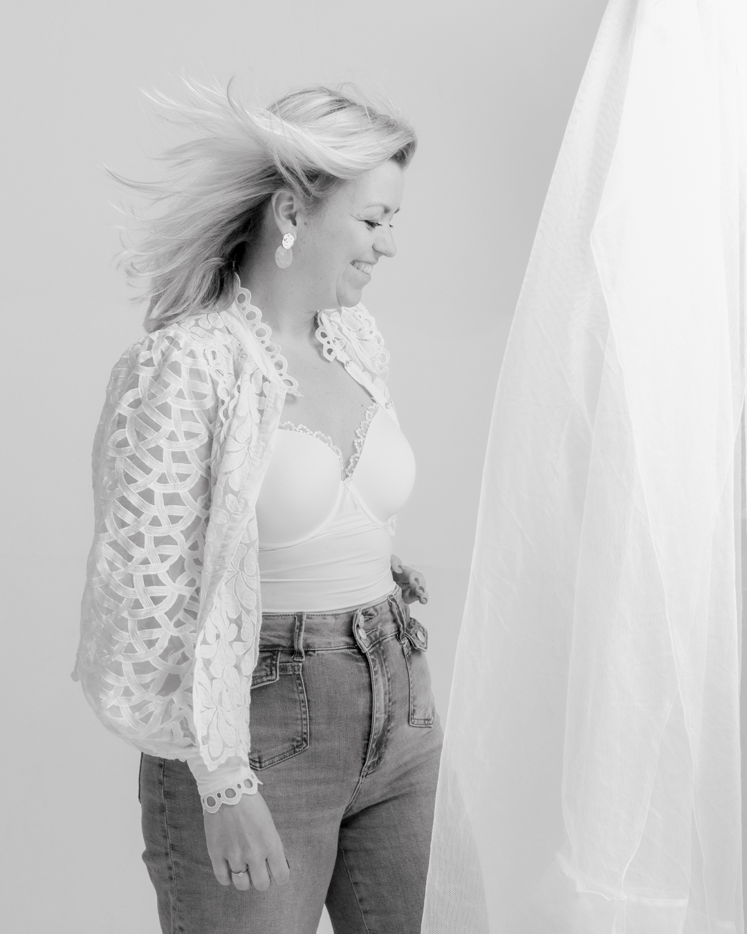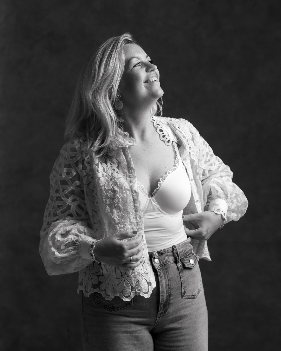 Fleur fotografeert en filmt zichzelf regelmatig zelf in promotiefilmpjes voor haar bedrijf Riets Lingerie. Maar dit was toch wat anders zei ze. Waar ze zich dan heel erg bewust is van de kant van zichzelf (letterlijk) die ze laat zien was dat iets om nu los te laten. Met een playlist van Bruno Mars (want daar dans ik graag op met de kinderen) en Adèle en diverse setjes kleding gingen we aan de slag. Fleur praat makkelijk, lacht veel en gebruikt haar handen vaak tijdens het praten. Allemaal kenmerken die je terug zie komen in de foto’s die ik van haar gemaakt heb.