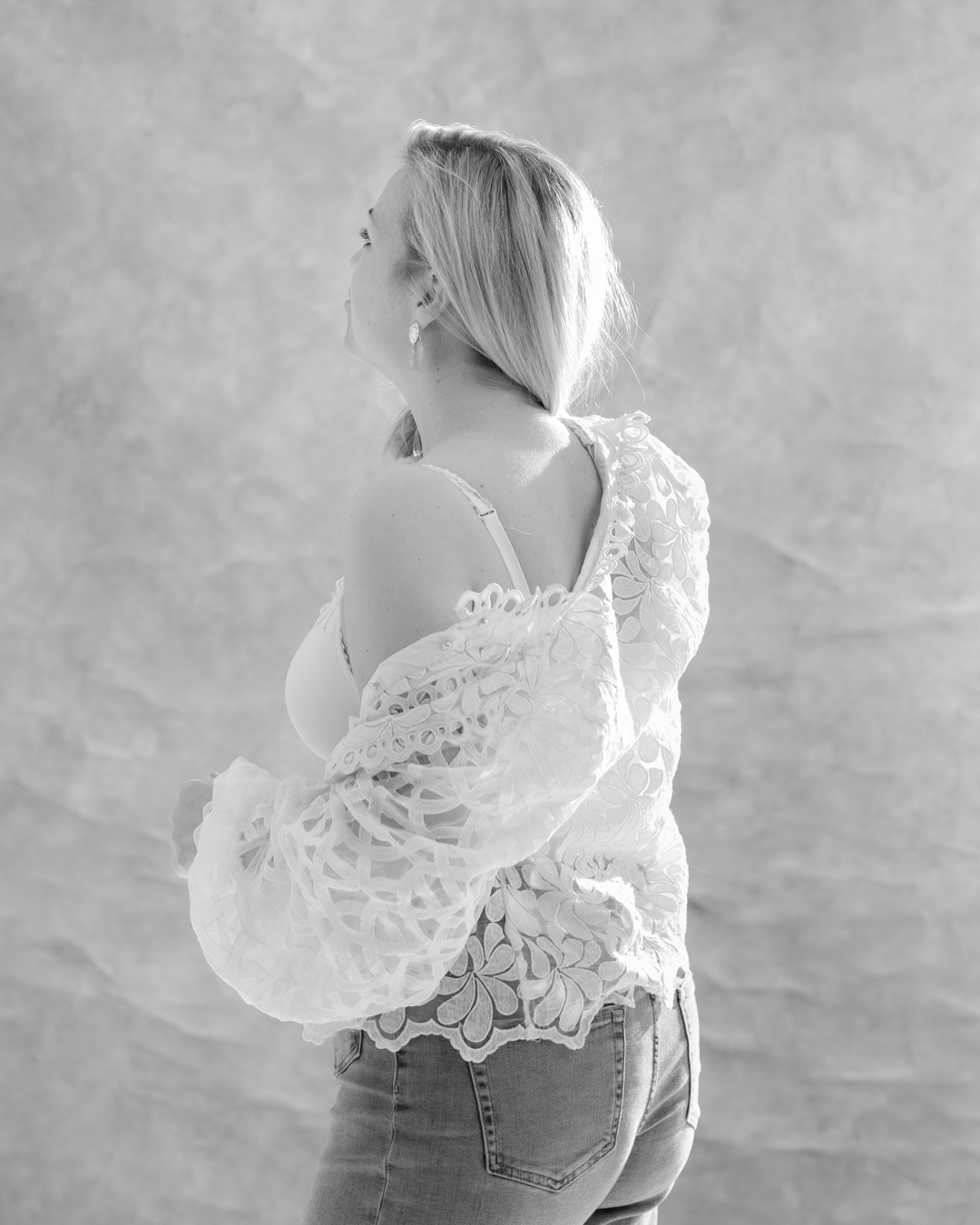 Fleur fotografeert en filmt zichzelf regelmatig zelf in promotiefilmpjes voor haar bedrijf Riets Lingerie. Maar dit was toch wat anders zei ze. Waar ze zich dan heel erg bewust is van de kant van zichzelf (letterlijk) die ze laat zien was dat iets om nu los te laten. Met een playlist van Bruno Mars (want daar dans ik graag op met de kinderen) en Adèle en diverse setjes kleding gingen we aan de slag. Fleur praat makkelijk, lacht veel en gebruikt haar handen vaak tijdens het praten. Allemaal kenmerken die je terug zie komen in de foto’s die ik van haar gemaakt heb.