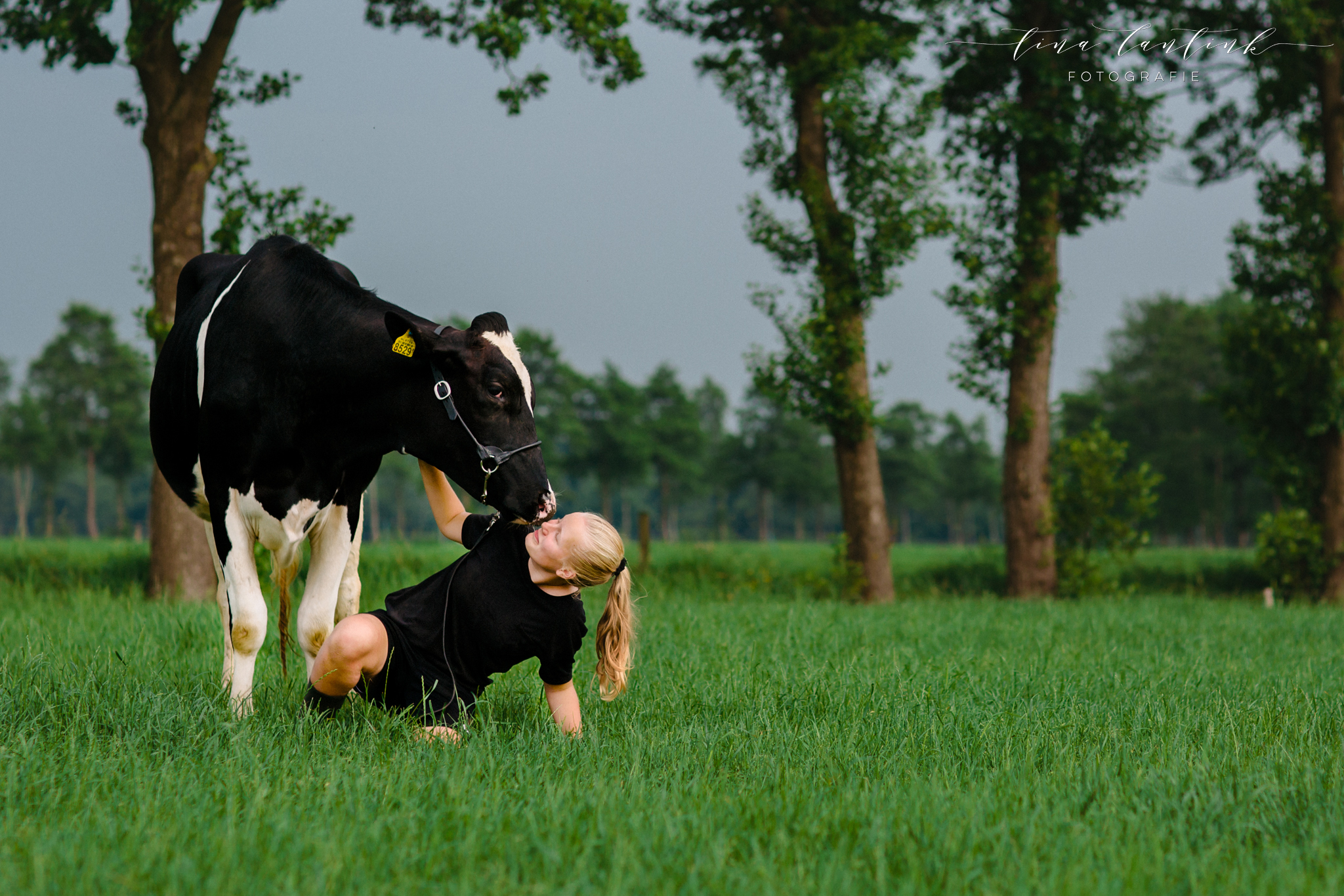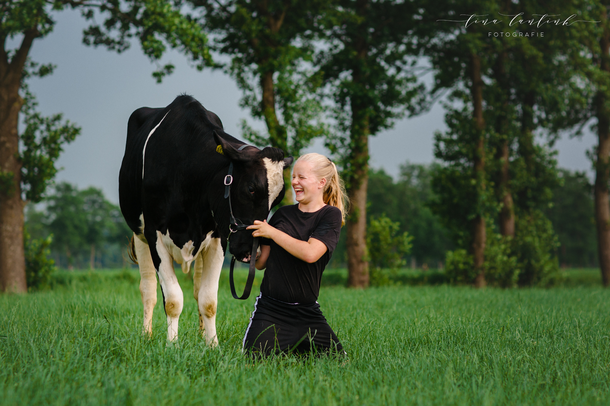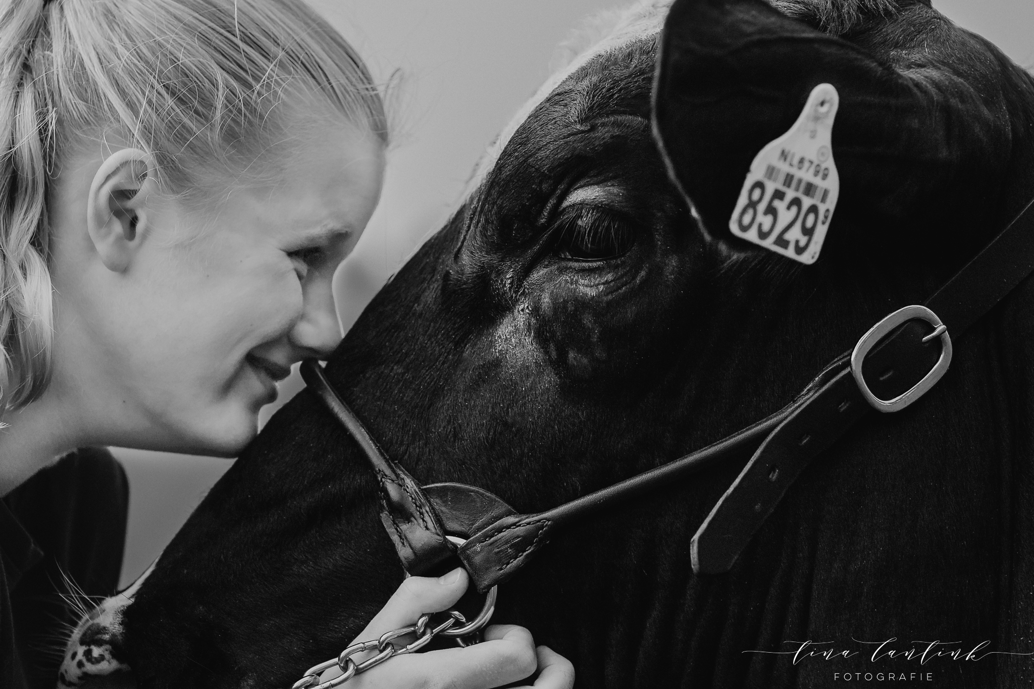 Van jongs af aan worden de kalveren getraind. Renate ligt na schooltijd bij ze in het stro, knuffelt met ze, gaat met ze wandelen en ook spelen doet ze met Fly Baby, ‘haar’ koe. Tijdens de shoot heb ik een beetje een beeld kunnen krijgen van hoe dit in zijn werk gaat. Net als bij andere dieren is hier veel geduld voor nodig. En  net als bij kleine kinderen en huisdieren blijken ook koeien omkoopbaar te zijn om even dat te doen wat je graag zou willen dat ze doen. Met wat bix in dit geval! 🙂 Hoe leuk en bijzonder was het om de band tussen Renate en Fly Baby te zien en vast te mogen leggen.