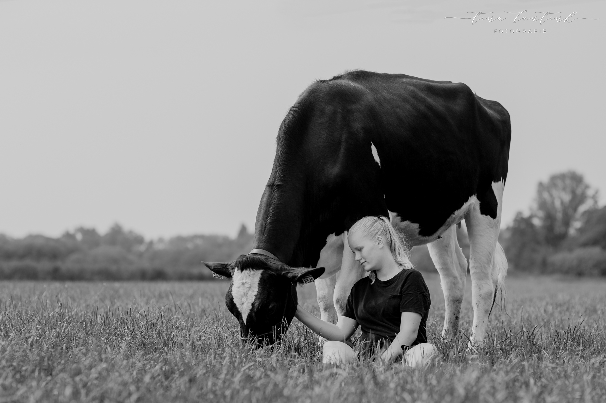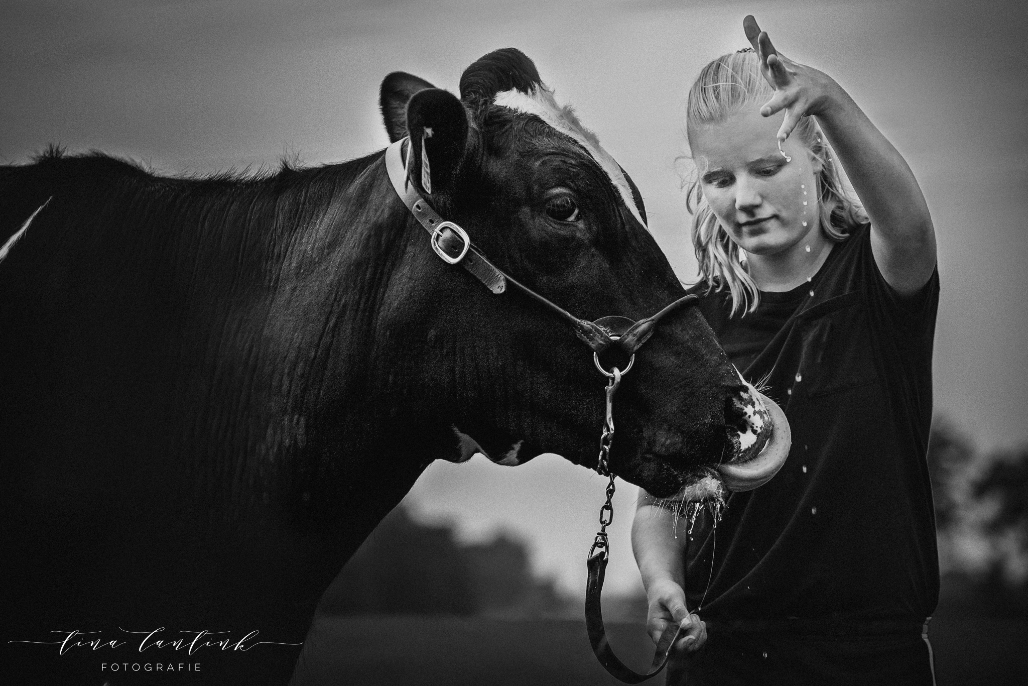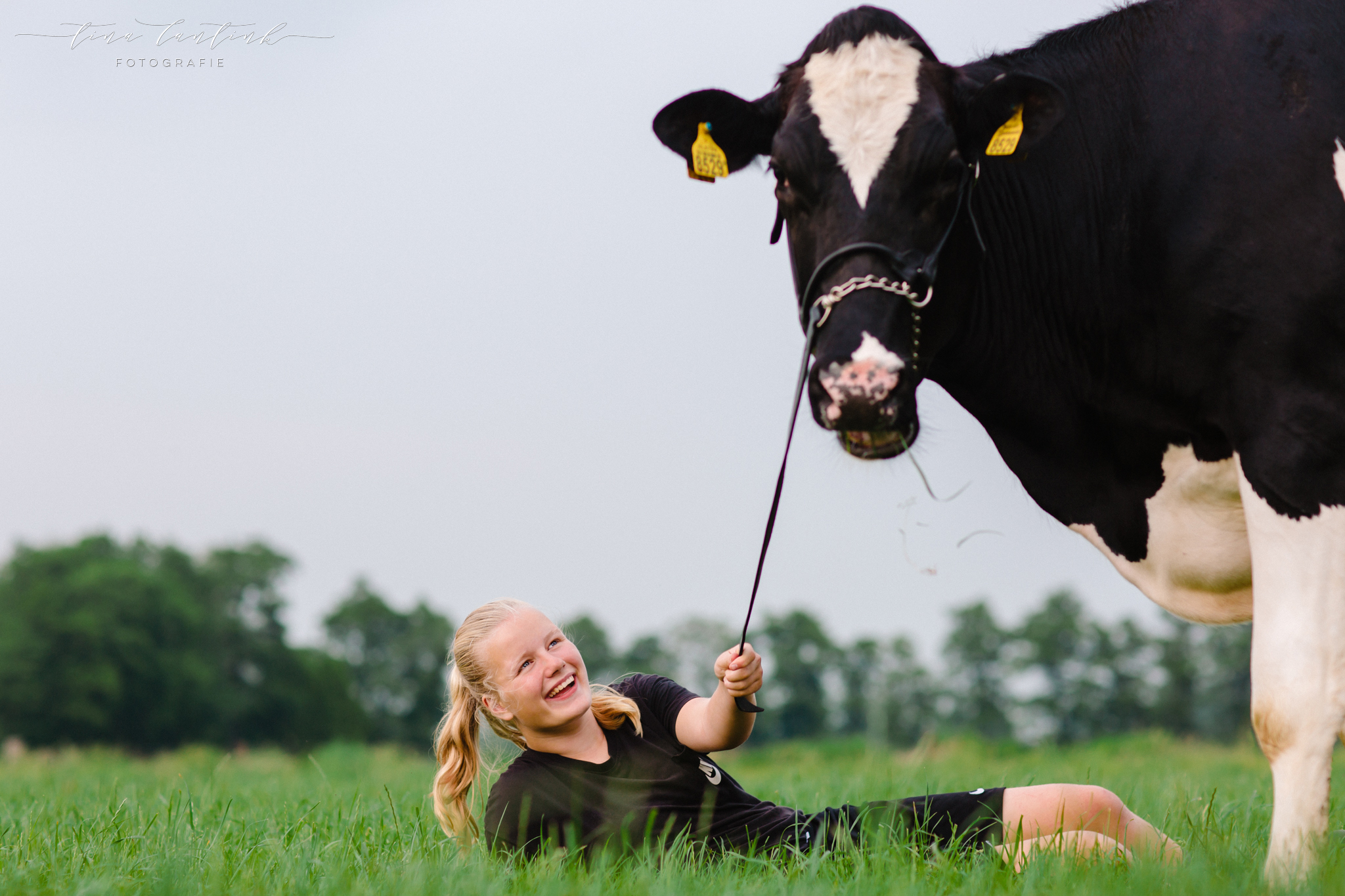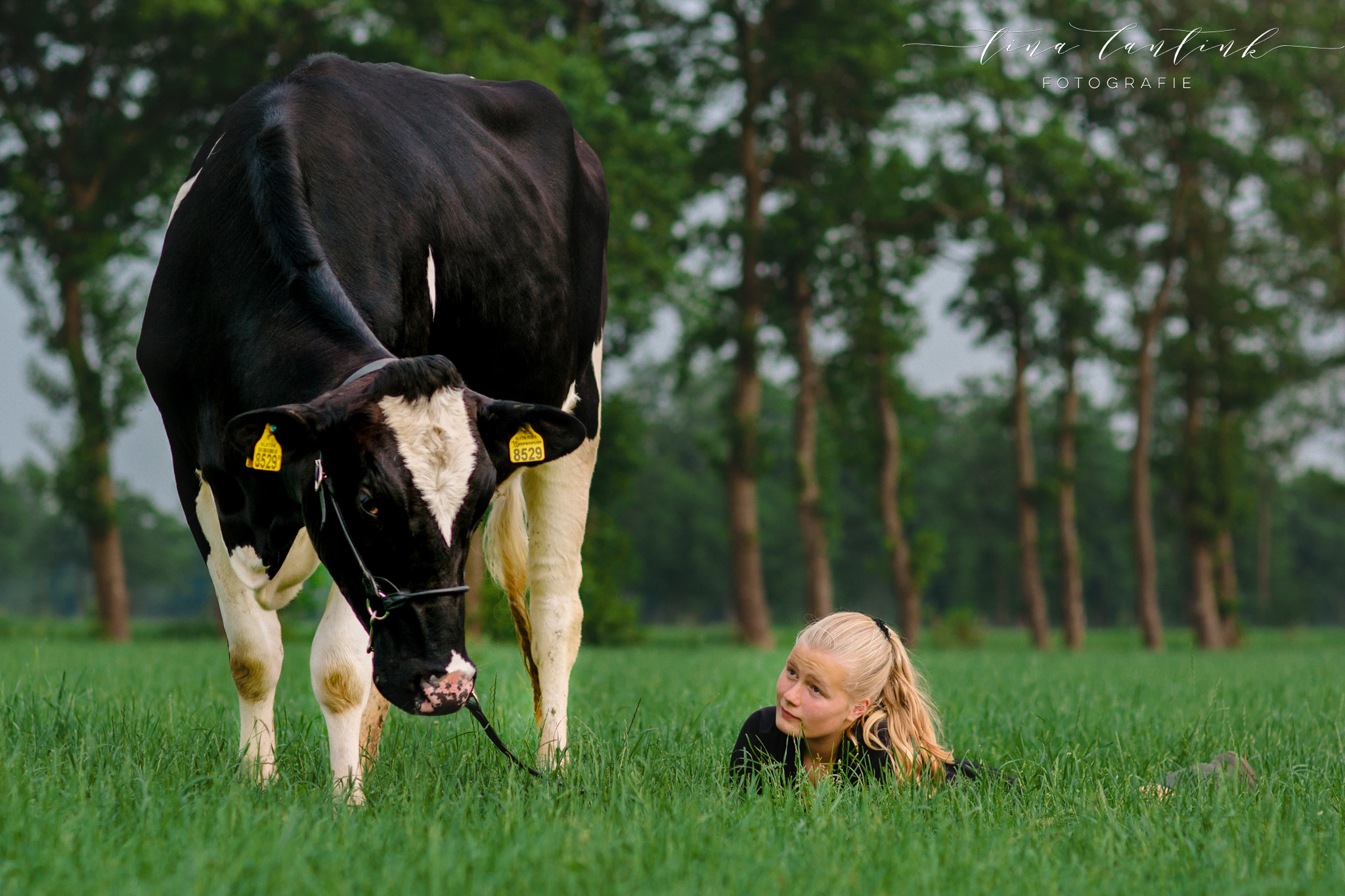 Van jongs af aan worden de kalveren getraind. Renate ligt na schooltijd bij ze in het stro, knuffelt met ze, gaat met ze wandelen en ook spelen doet ze met Fly Baby, ‘haar’ koe. Tijdens de shoot heb ik een beetje een beeld kunnen krijgen van hoe dit in zijn werk gaat. Net als bij andere dieren is hier veel geduld voor nodig. En  net als bij kleine kinderen en huisdieren blijken ook koeien omkoopbaar te zijn om even dat te doen wat je graag zou willen dat ze doen. Met wat bix in dit geval! 🙂 Hoe leuk en bijzonder was het om de band tussen Renate en Fly Baby te zien en vast te mogen leggen.
