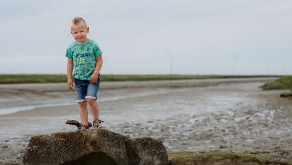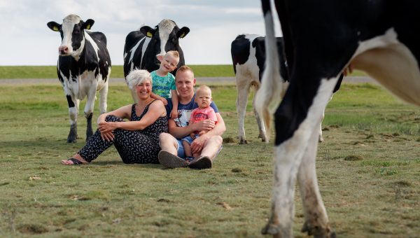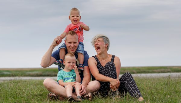 Wanneer mensen een fotoshoot op locatie willen laten maken vraag ik altijd of ze een specifieke locatie in gedachten hebben. Veelal is dat niet zo en dan probeer ik door een aantal opties voor te leggen samen tot een locatie te komen die bij deze mensen past. We hebben immers in deze omgeving de luxe dat we álle kanten op kunnen… “We houden wel van landelijk”, was de reactie dit keer. Noordpolderzijl werd het beginpunt van waaruit we zouden rondkijken naar de mogelijkheden op de omliggende landerijen. Eénmaal achter de dijk liepen daar ook koeien. Na eerst wat foto’s nabij de waterkant gemaakt te hebben besloten we om een plekje op de kwelders te zoeken met de koeien op de achtergrond. Plekje gevonden, iedereen op z’n plek……. En toen kwamen onze figuranten wel héél dichtbij! Hoe landelijk wil je het hebben?! 🙂 Prachtig die koeien om het gezin heen, snuffelend, af en toe schrikkend, met hun neuzen in de tassen (met omkoopwaar voor als de kinderen hun best deden ;)) de reacties van de kinderen op de dieren. Echt een supermoment.
