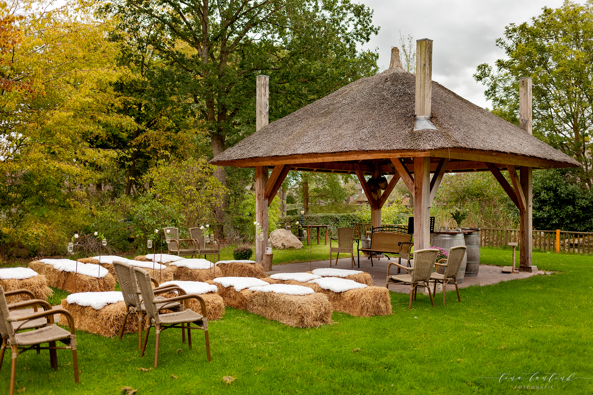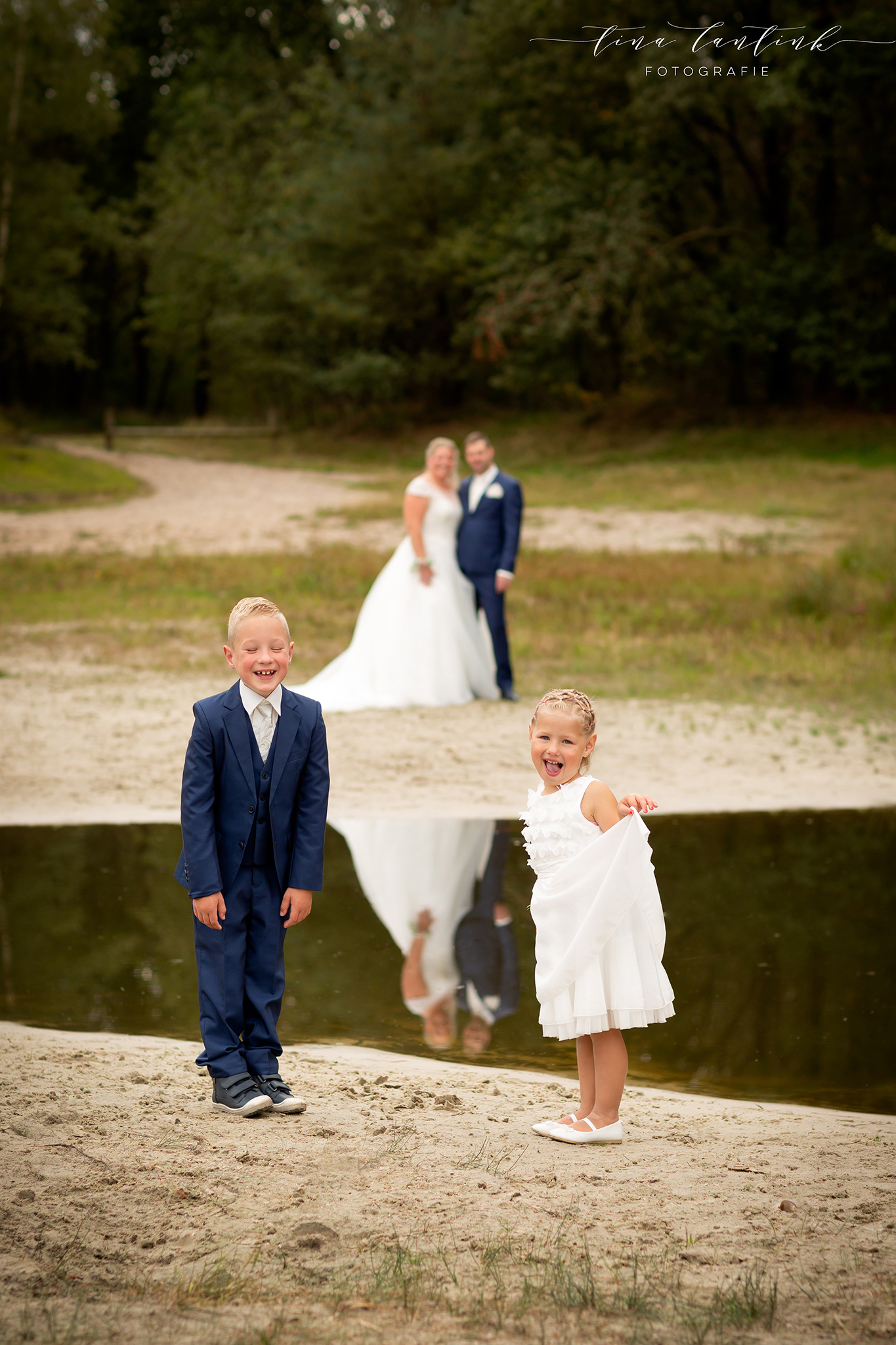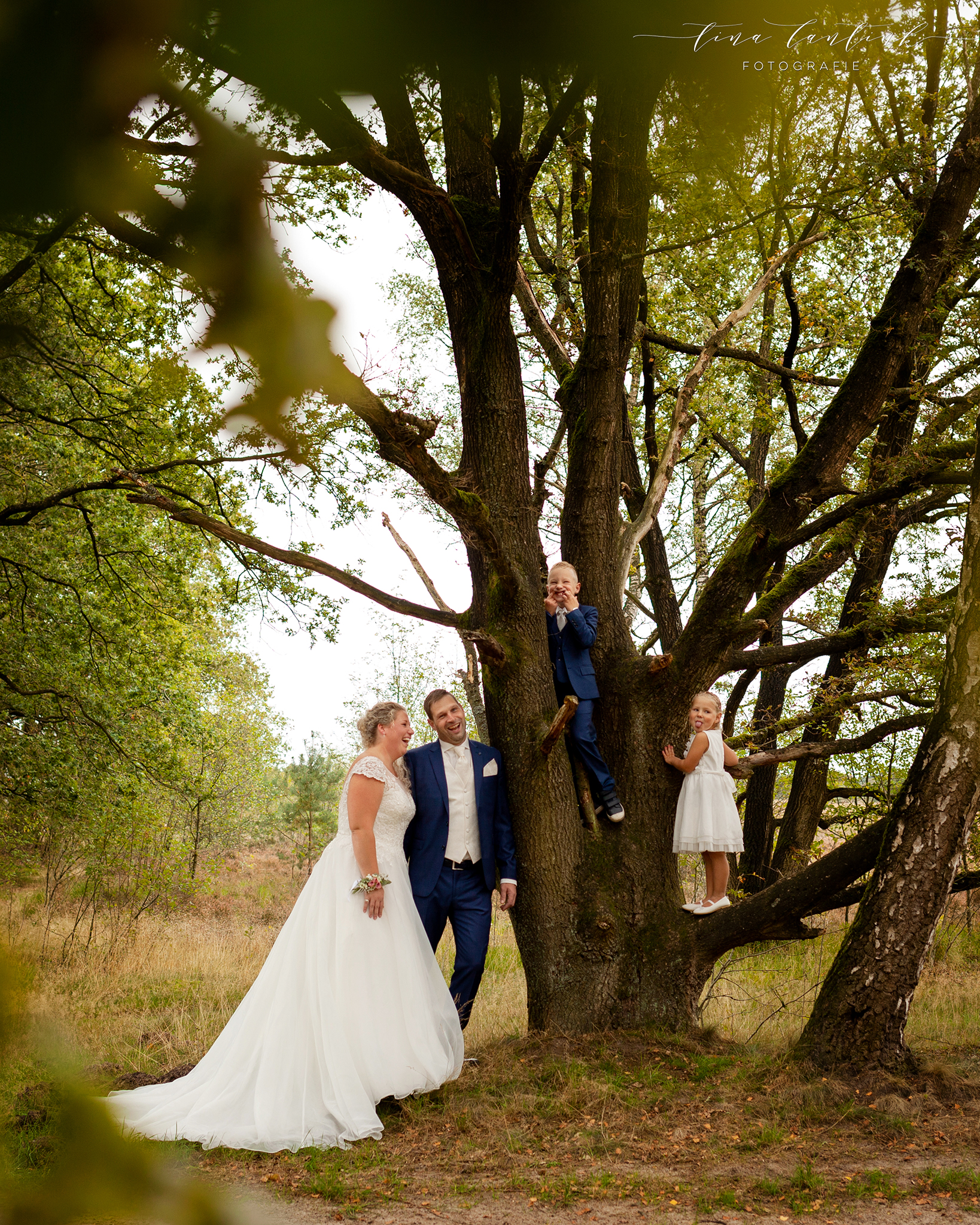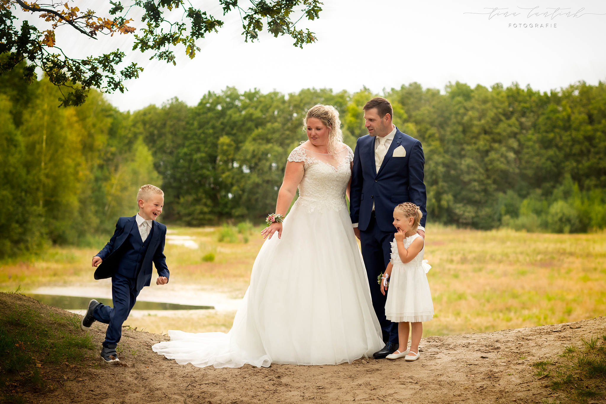 Nadat de mannen de dames opgehaald hadden begonnen we met veel lol aan de fotoshoot op de hei nabij Uffelte. Een mooie afwisseling van bos, zand, water en de heide. Een ideale plek ook voor de kinderen om rond te rennen en boompje te klimmen. Vervolgens was de huwelijksvoltrekking in een prachtige setting in de tuin van De Huiskamer. Wauw, wat een sfeer hebben ze daar neergezet! Zittend op kleedjes op strobalen zagen allemaal lieve familieleden en vrienden van Gert & Jonien hoe zij tijdens een mooie en soms emotionele toespraak “Ja” tegen elkaar zeiden. Davy & Elyn mochten de ringen aangeven en ook de kinderakte tekenen. Wat een belangrijke rollen voor deze twee!
