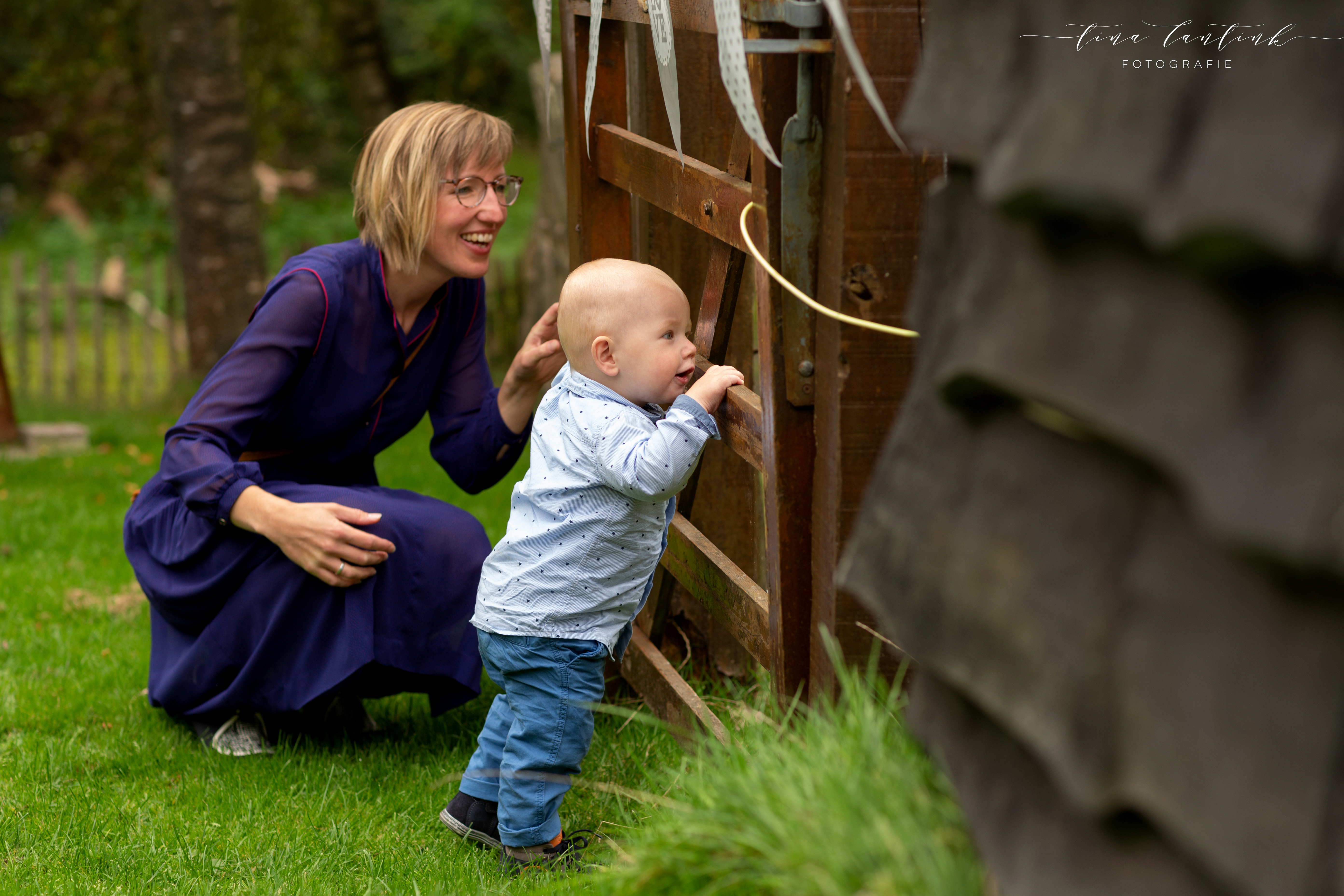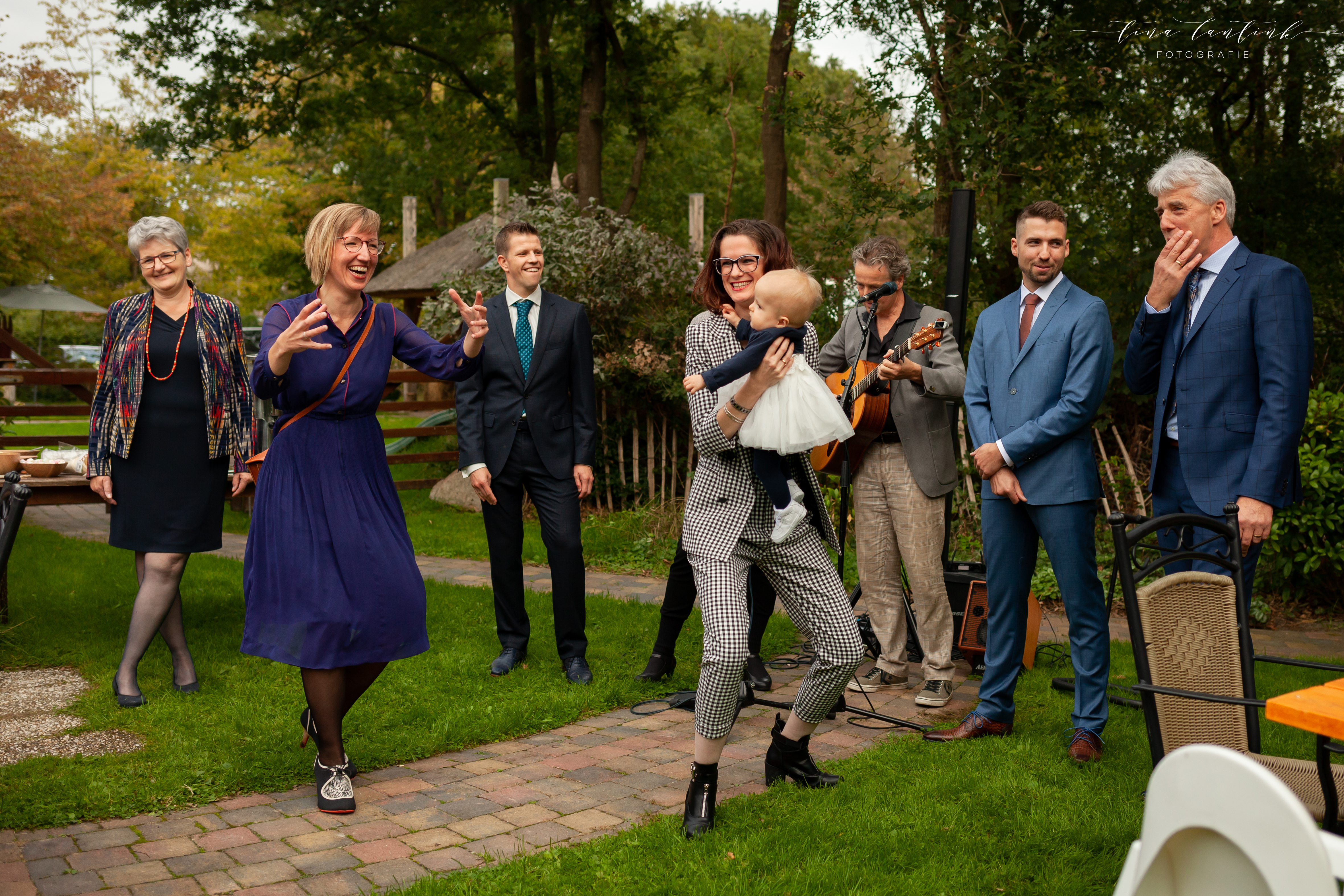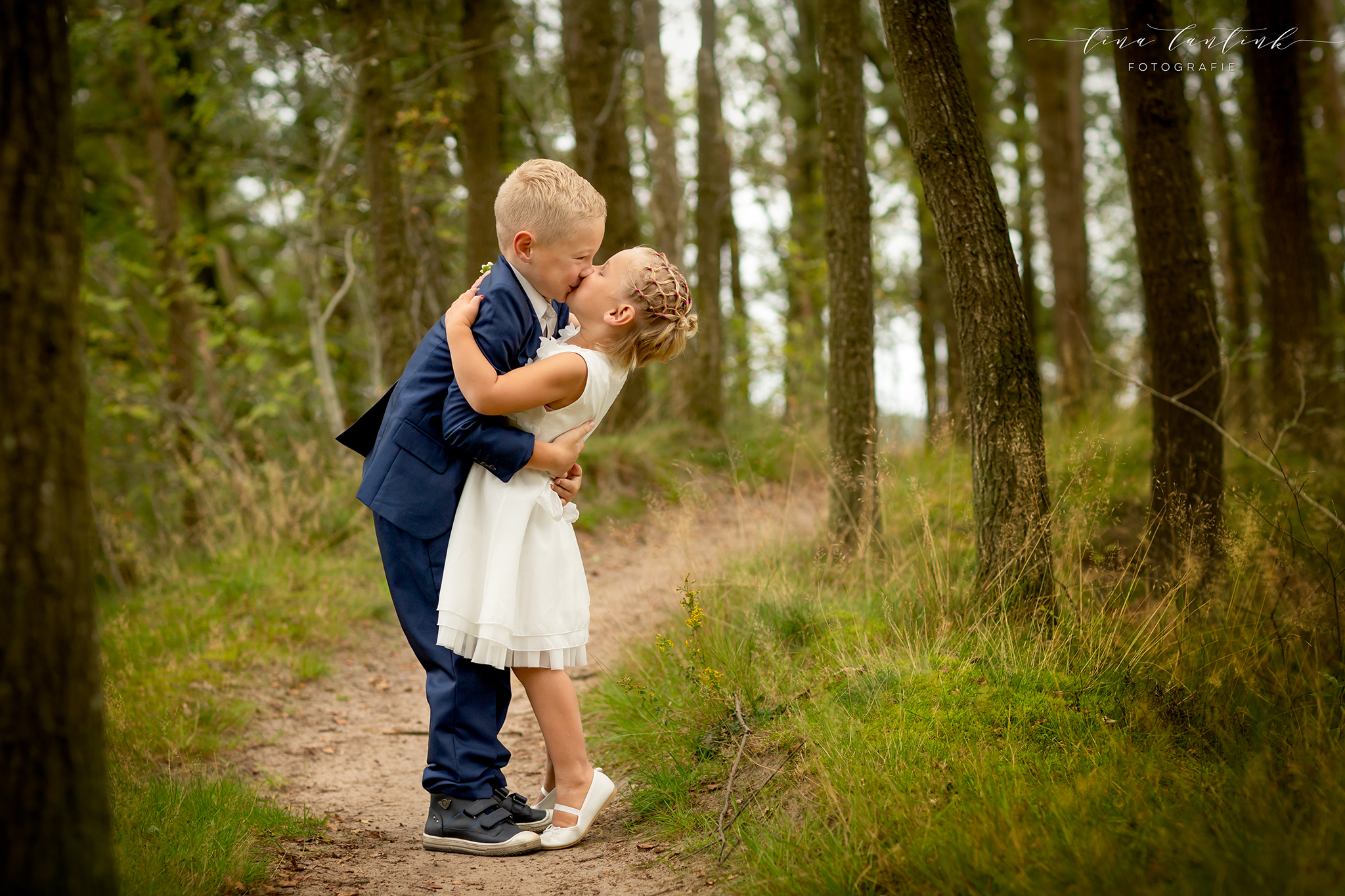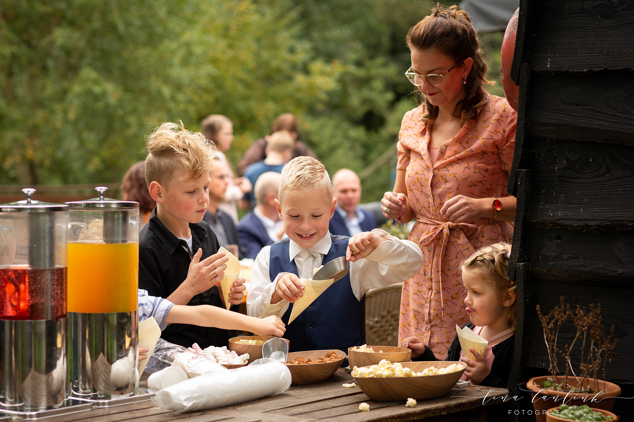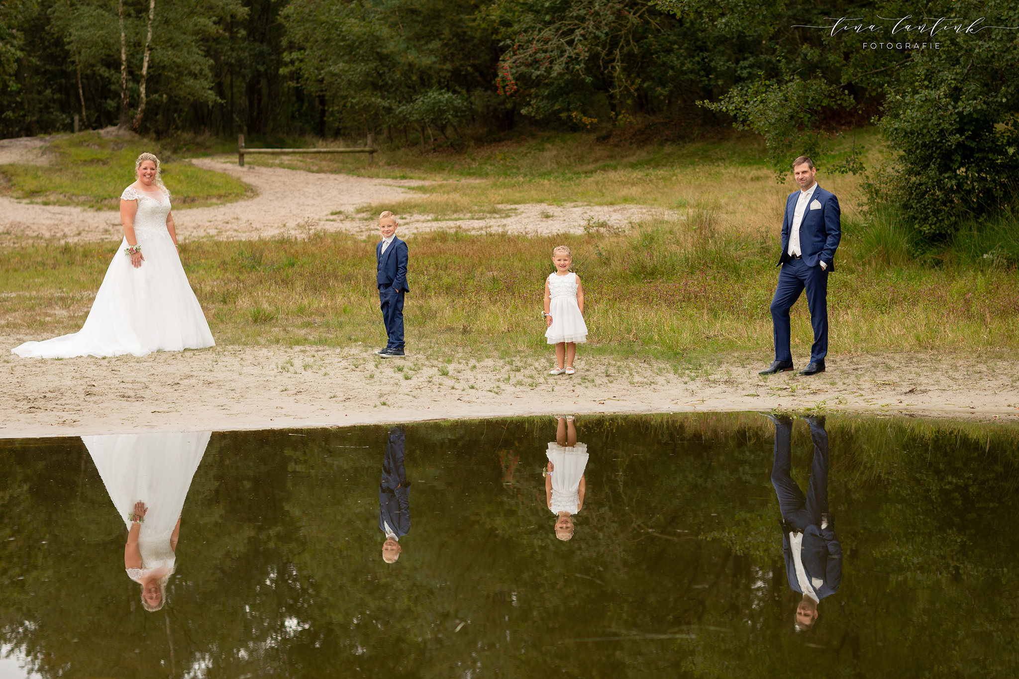Nadat de mannen de dames opgehaald hadden begonnen we met veel lol aan de fotoshoot op de hei nabij Uffelte. Een mooie afwisseling van bos, zand, water en de heide. Een ideale plek ook voor de kinderen om rond te rennen en boompje te klimmen. Vervolgens was de huwelijksvoltrekking in een prachtige setting in de tuin van De Huiskamer. Wauw, wat een sfeer hebben ze daar neergezet! Zittend op kleedjes op strobalen zagen allemaal lieve familieleden en vrienden van Gert & Jonien hoe zij tijdens een mooie en soms emotionele toespraak “Ja” tegen elkaar zeiden. Davy & Elyn mochten de ringen aangeven en ook de kinderakte tekenen. Wat een belangrijke rollen voor deze twee!